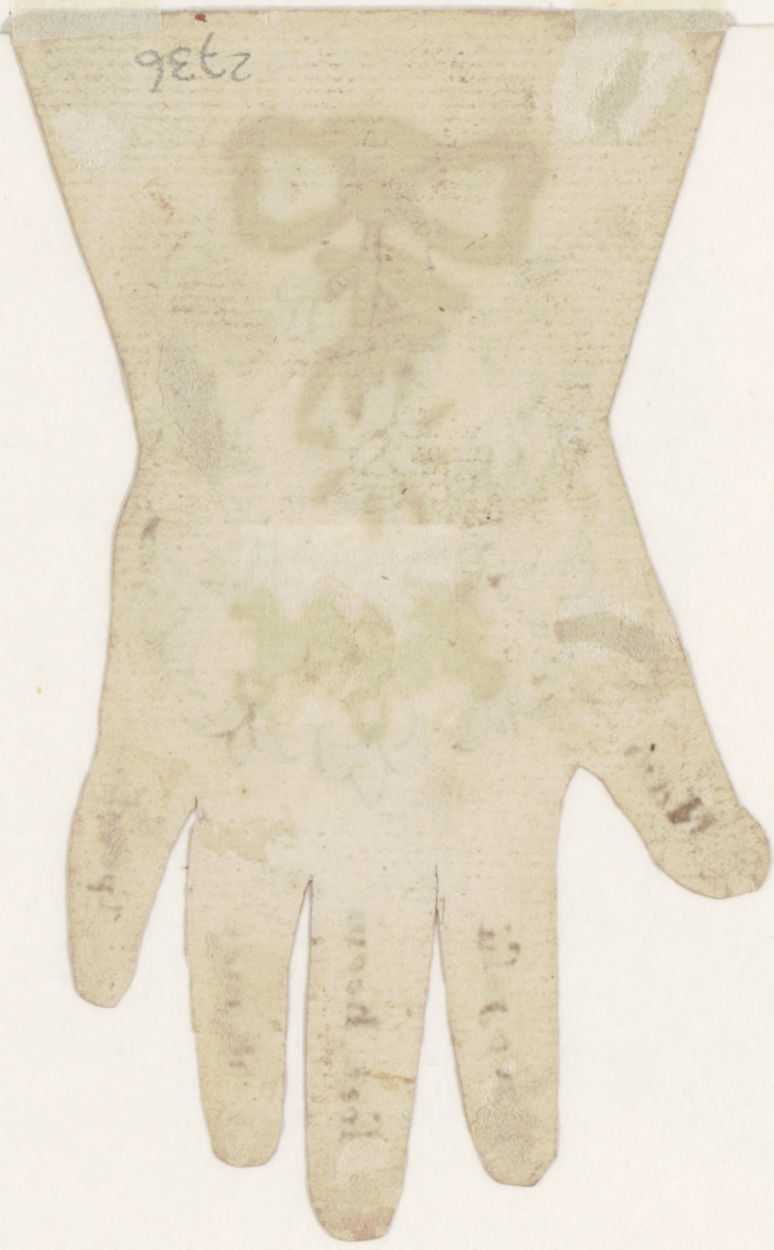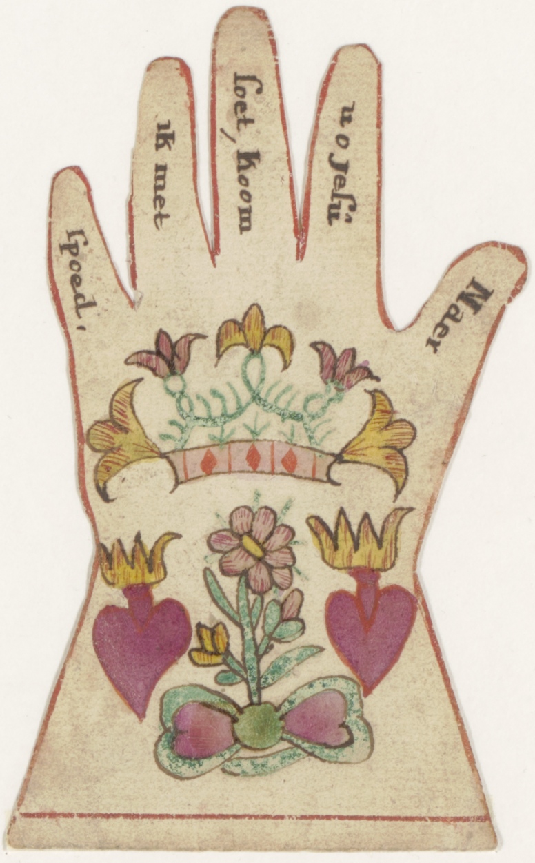 Linkerhandschoen met H. Harten en tekst op vingers "Naer u o Jesu soet, Koom ik met spoed."