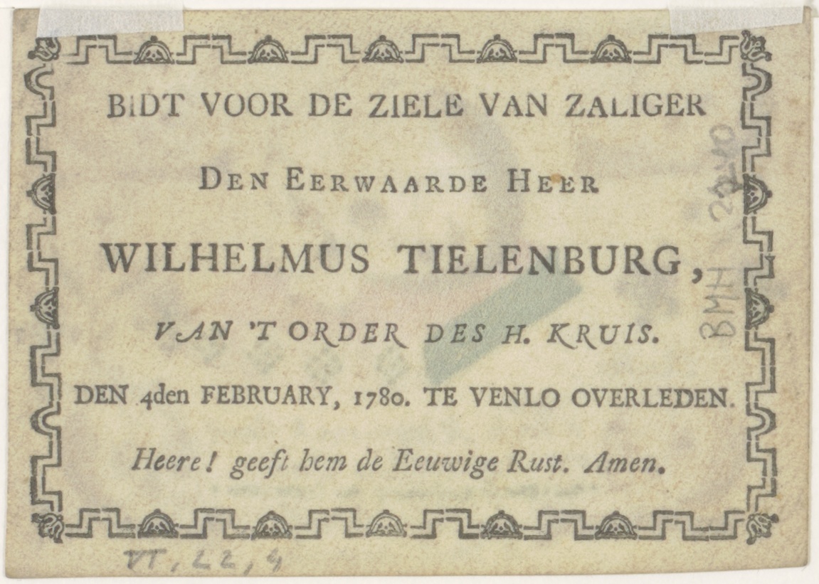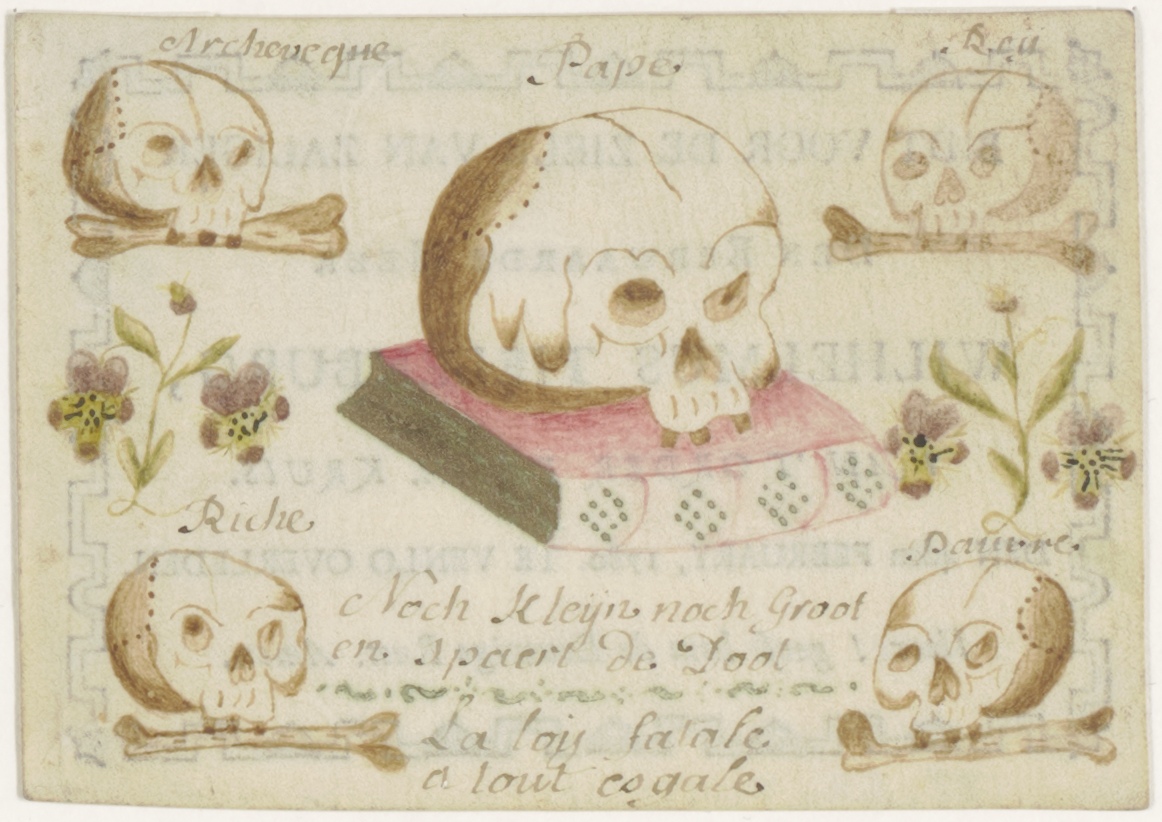 Vanitas, schedels op boek, met Nederlandse en Franse tekst, ingekleurd, kz. Religieus;Bid voor ziel Wilhelmus Tielenburg (+1780);van de order van H. Kruis;Venlo;