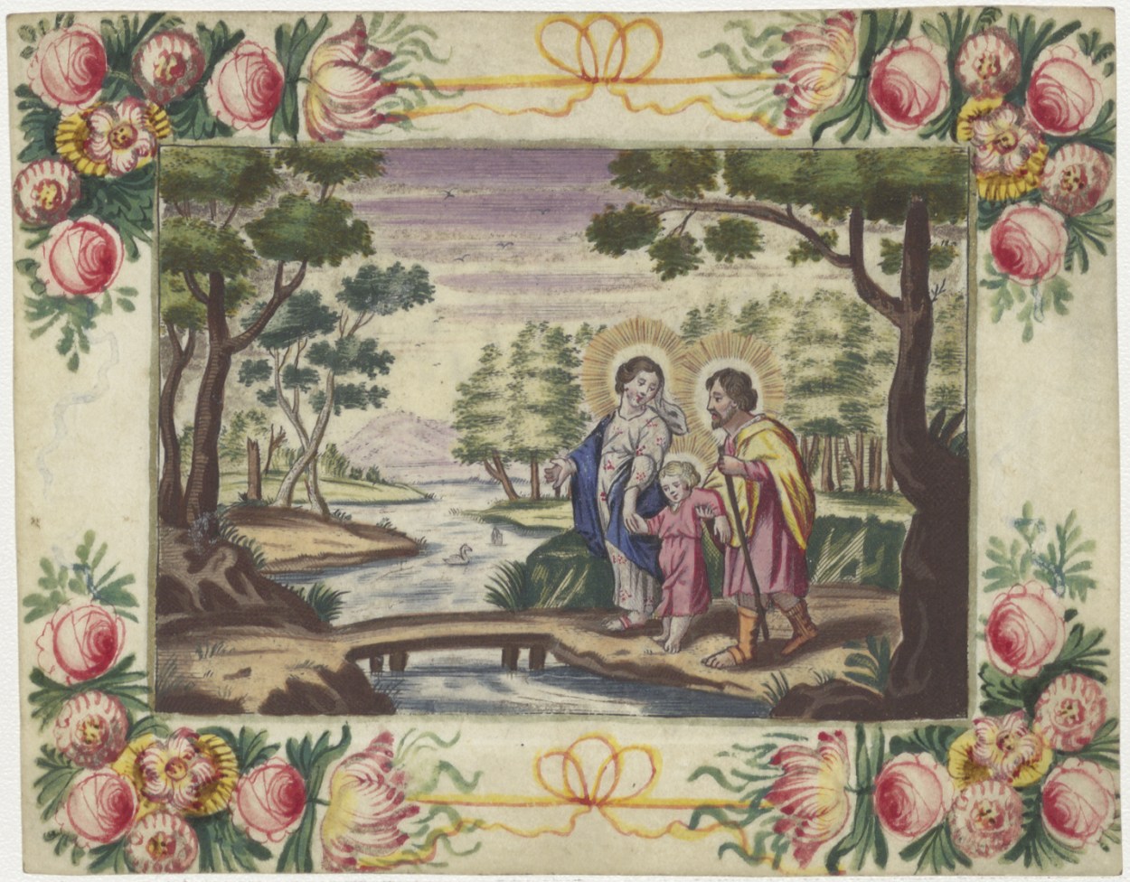 H. Familie bij brug, wandelend, ingekleurd, kz. Religieus;Bid voor ziel Pasquier Quesnel (+1719);Amsterdam;