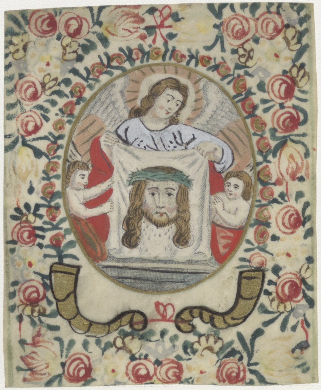 Engel met Veronicadoek met gezicht van Christus, ingekleurd, kz. Religieus;Bid voor ziel ... (+1839);Amsterdam;