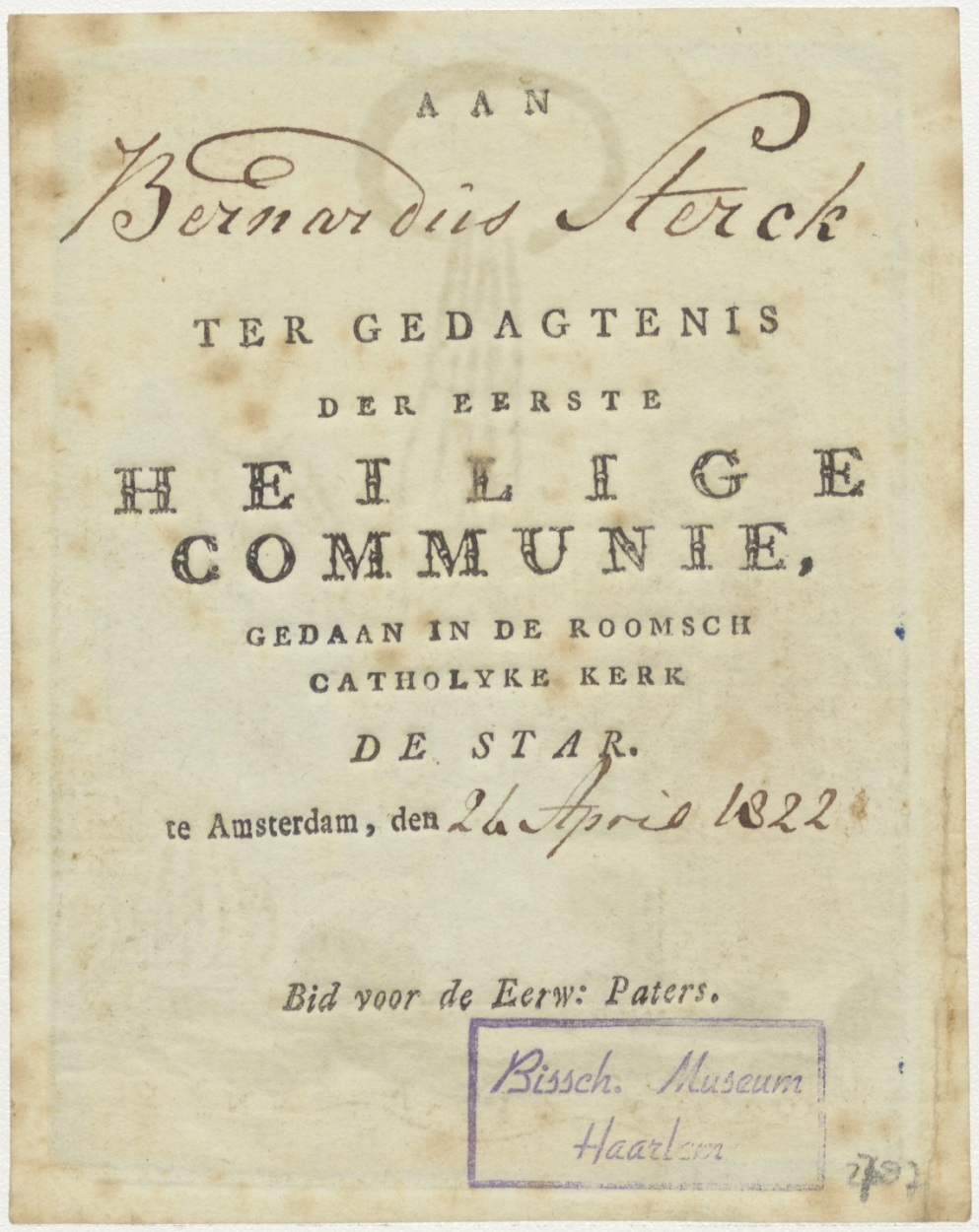 H. Joachim, Maria en Anna, ingekleurd, kz. H. Communie;1822;Sterck in de kerk De Star;Amsterdam;