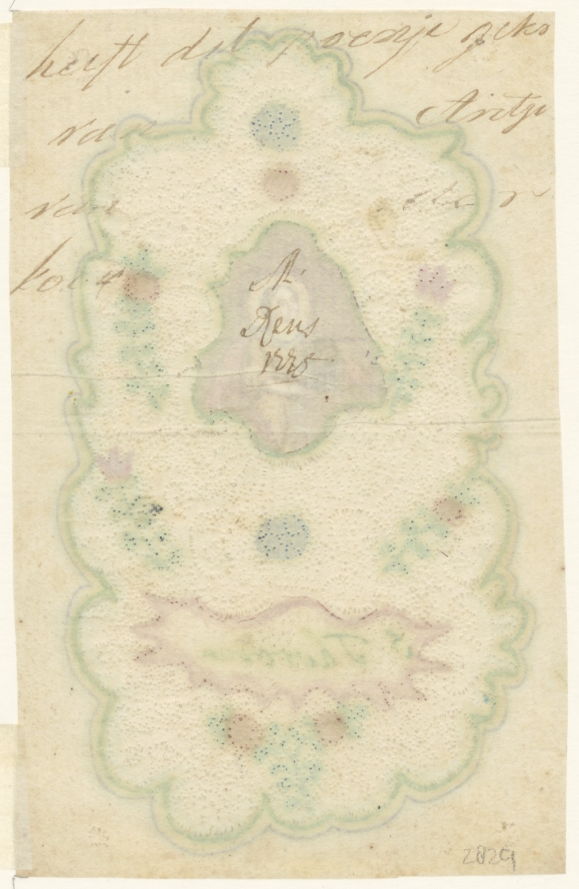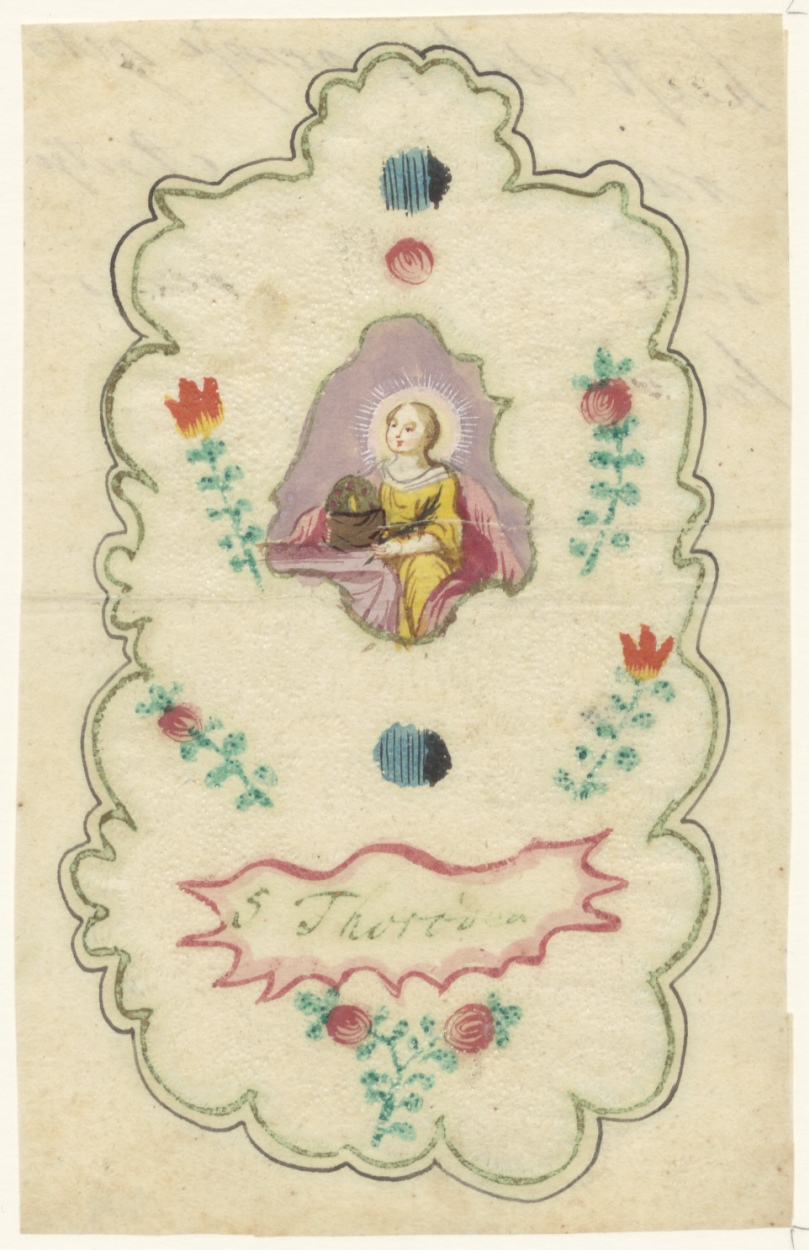 Vrouwelijke heilige, ingekleurd, kz. Tekst (?)