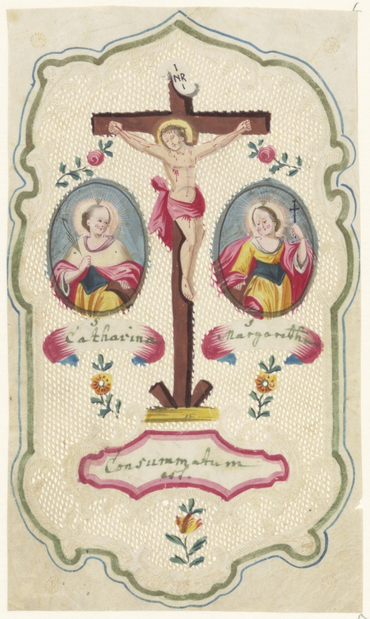 H. Catharina, H. Margaretha, consumatum est, Christus aan het kruis, ingekleurd