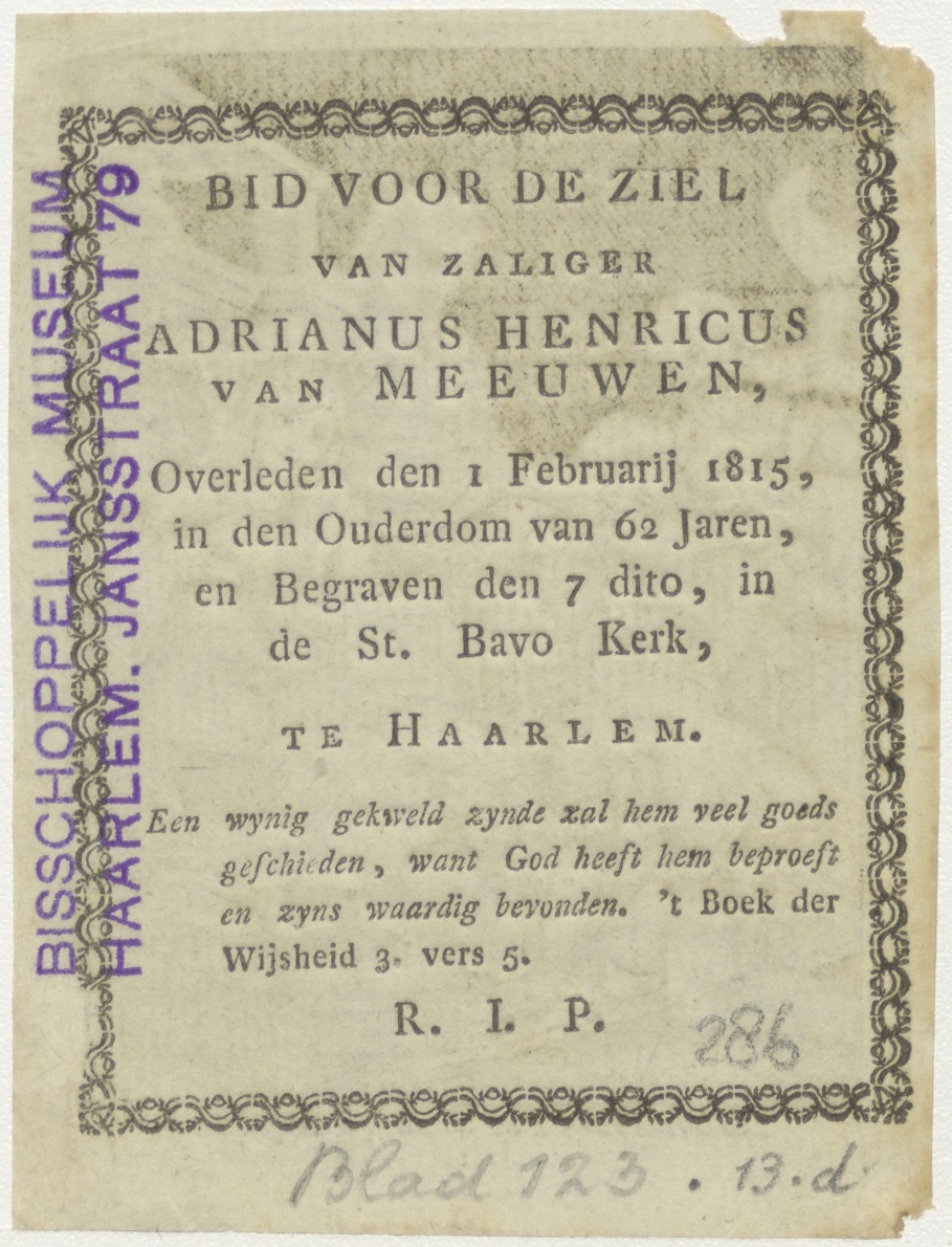 Geboorte van Christus, aanbidding der herders, kz. Bid voor ziel van Meeuwen (+1815);St. Bavokerk Haarlem;