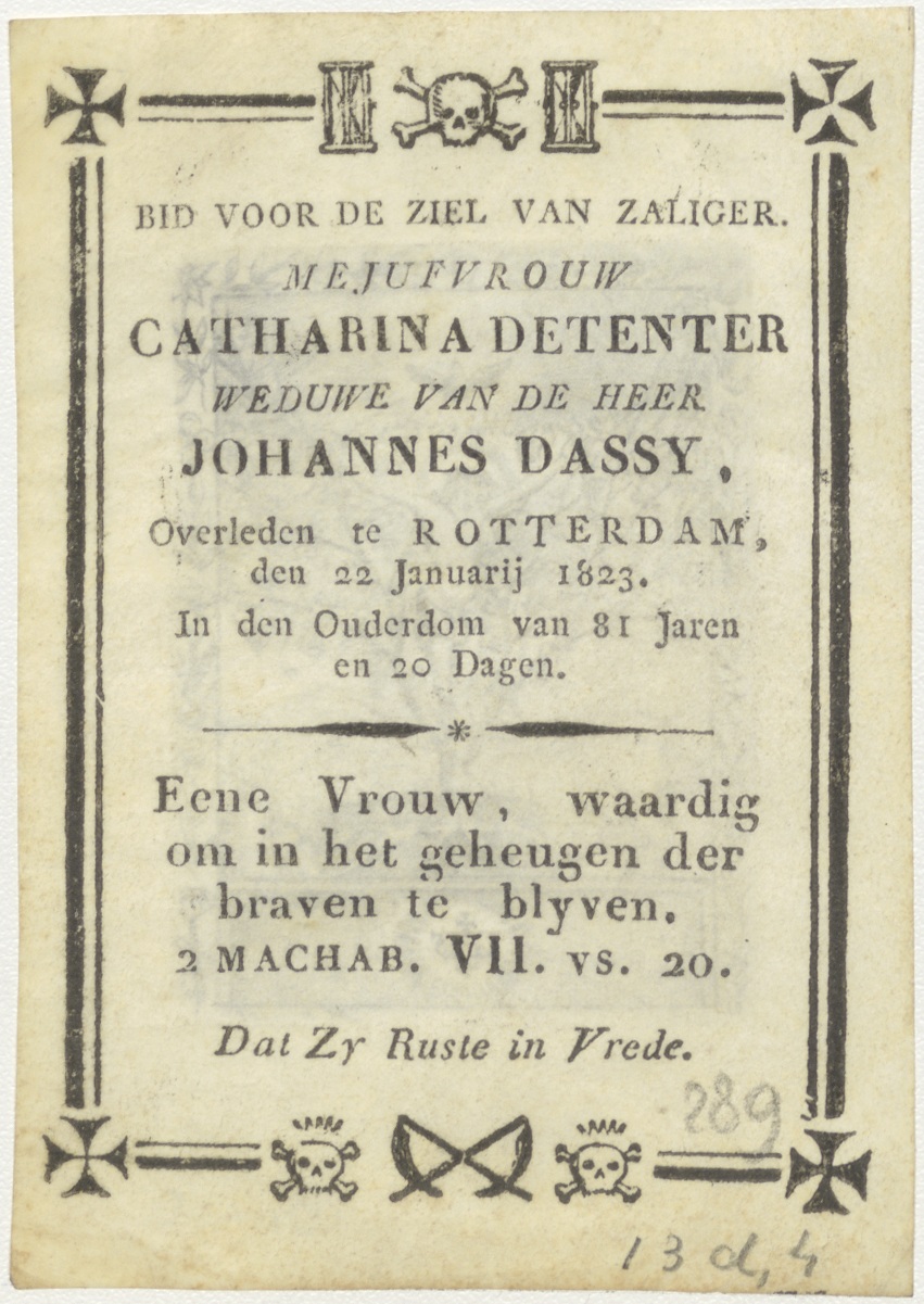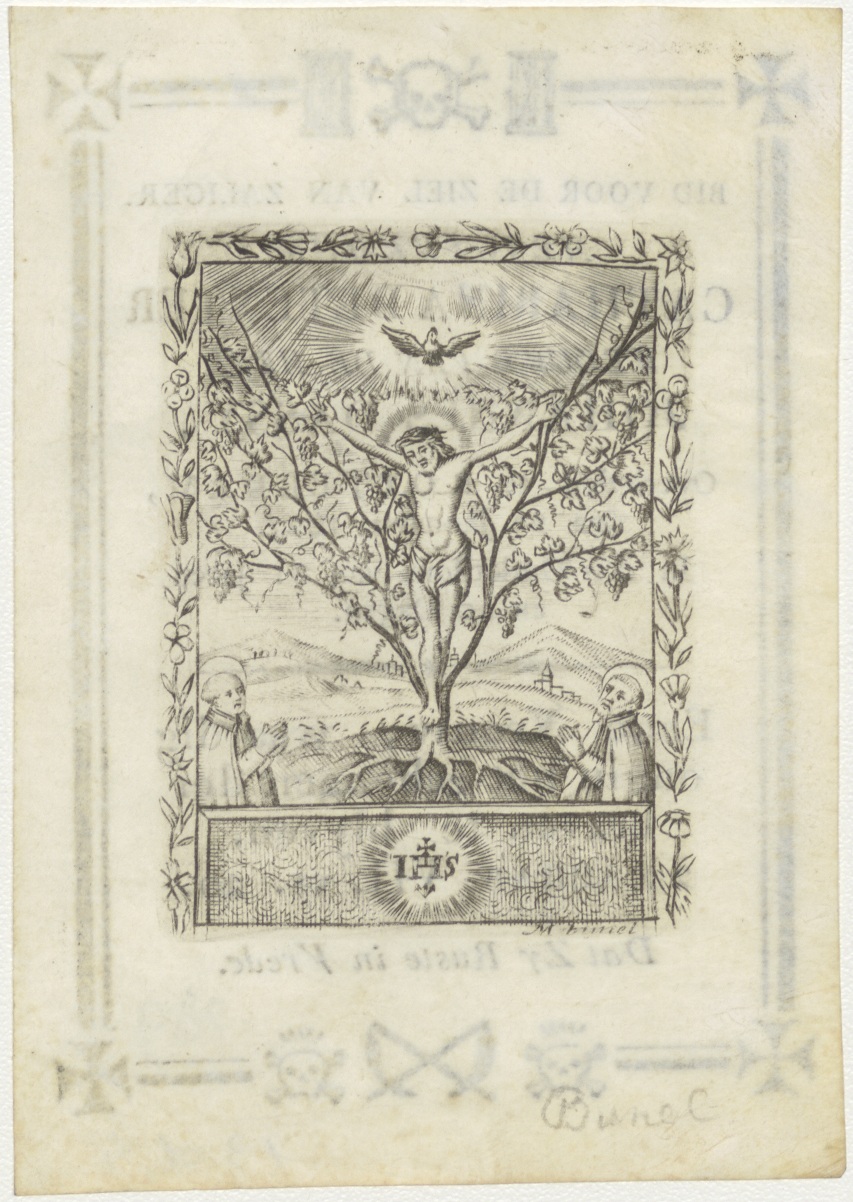 Christus aan kruis, in de vorm van boom met twee heiligen, kz. Bid voor ziel Dassy-Deventer (+1823);Rotterdam;