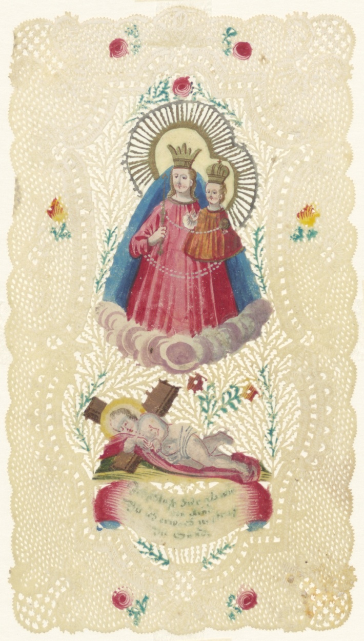 Maria met Christuskind, onderaan slapend Christuskind met kruis, ingekleurd