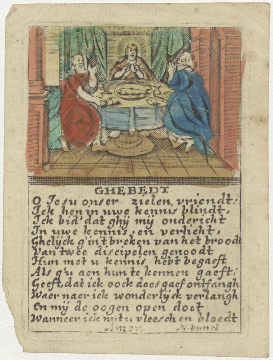 Christus' maaltijd met twee apostelen, Emmausgangers(?), met gebed, ingekleurd