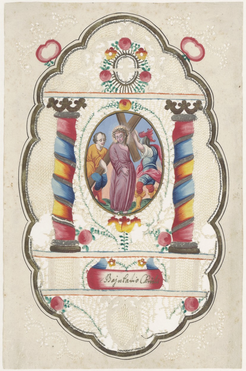 Passiescène: Christus draagt het kruis, ingekleurd