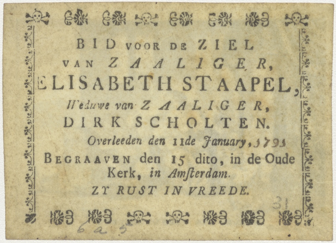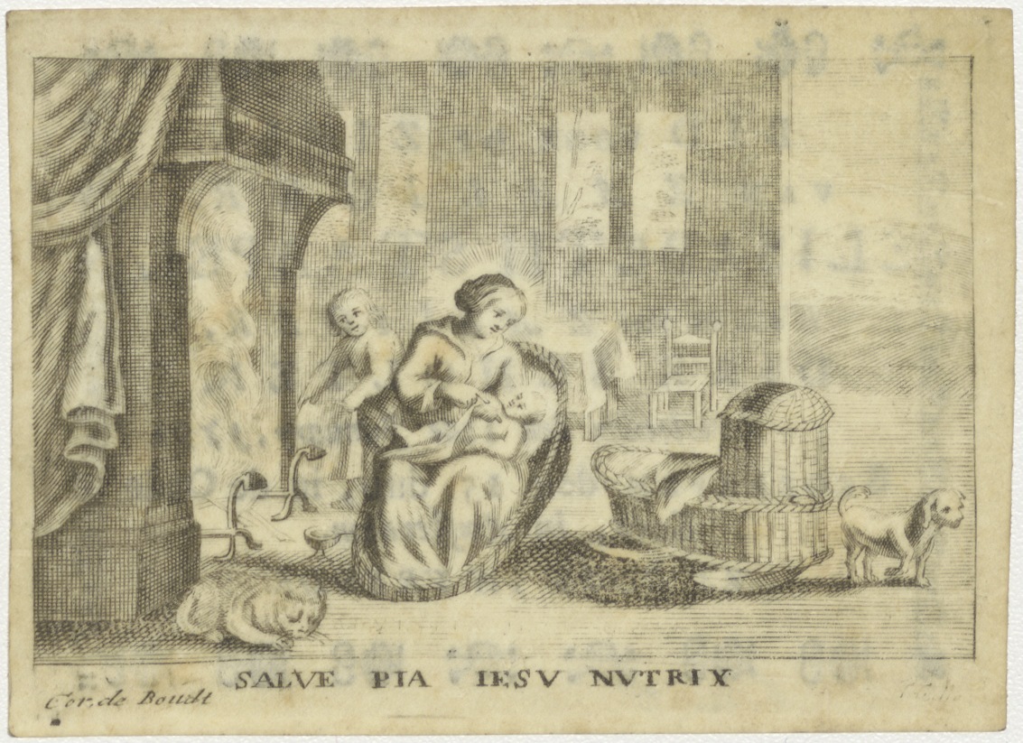 Maria wiegt Christuskind bij haard met Johannes huiselijk tafereel, kz. Bid voor ziel Zaalijer-Staapel (+1793);Oude Kerk Amsterdam;