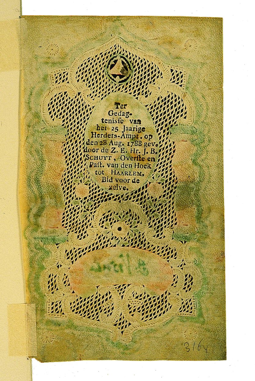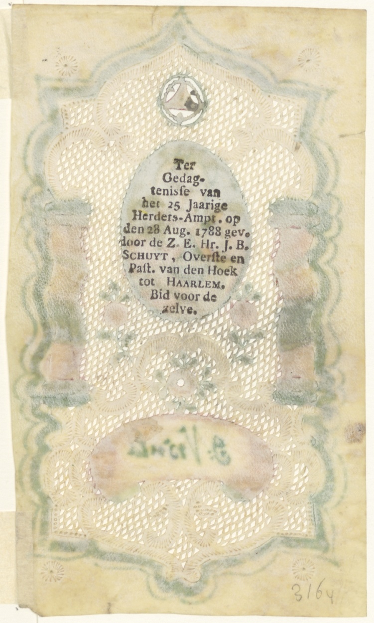H. Ursula, ingekleurd, kz. Religieus;25 jarig herders-ambt;1788;pastoor J.B. Schuyt;pastoor Van den Hoek;Haarlem;