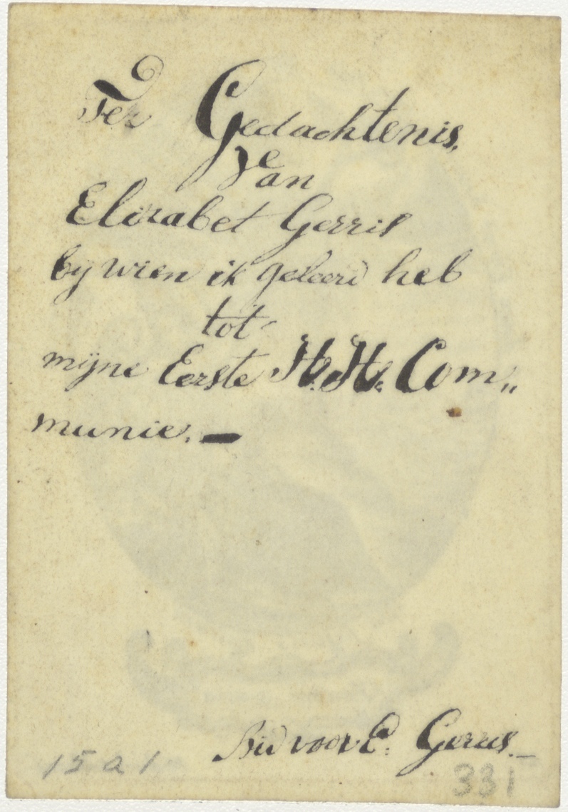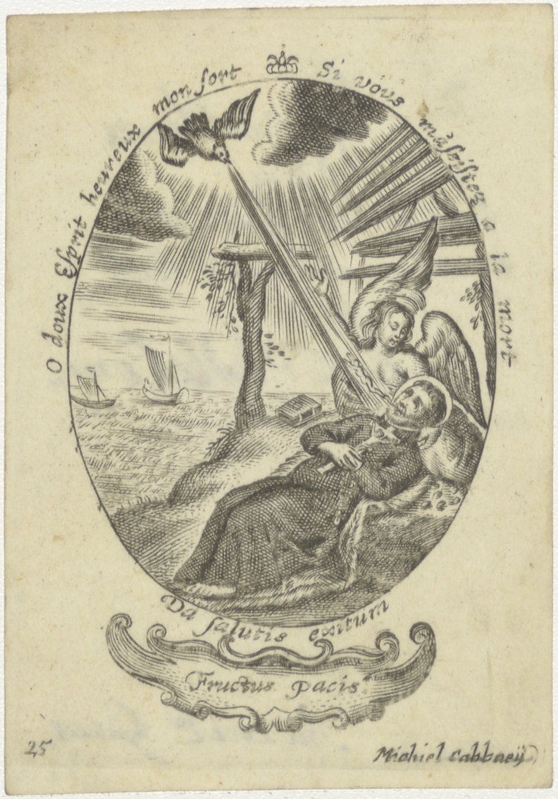 H. Geest (serie): Fructus pacis, stervende monnik met kruis en rozenkrans, kz. Gedachtenis aan Gerris, lerares voor mijn eerste communie