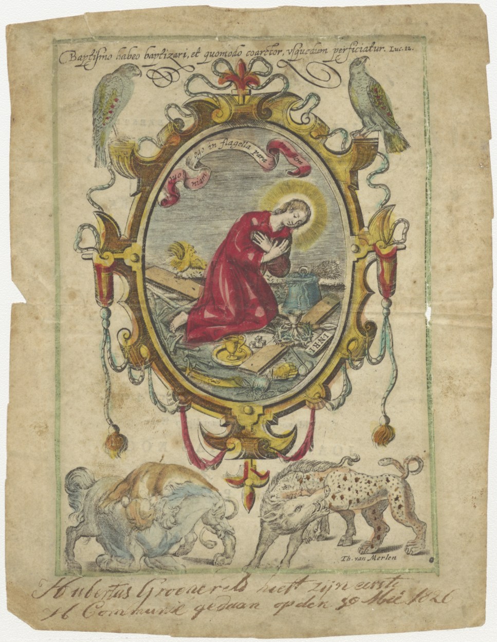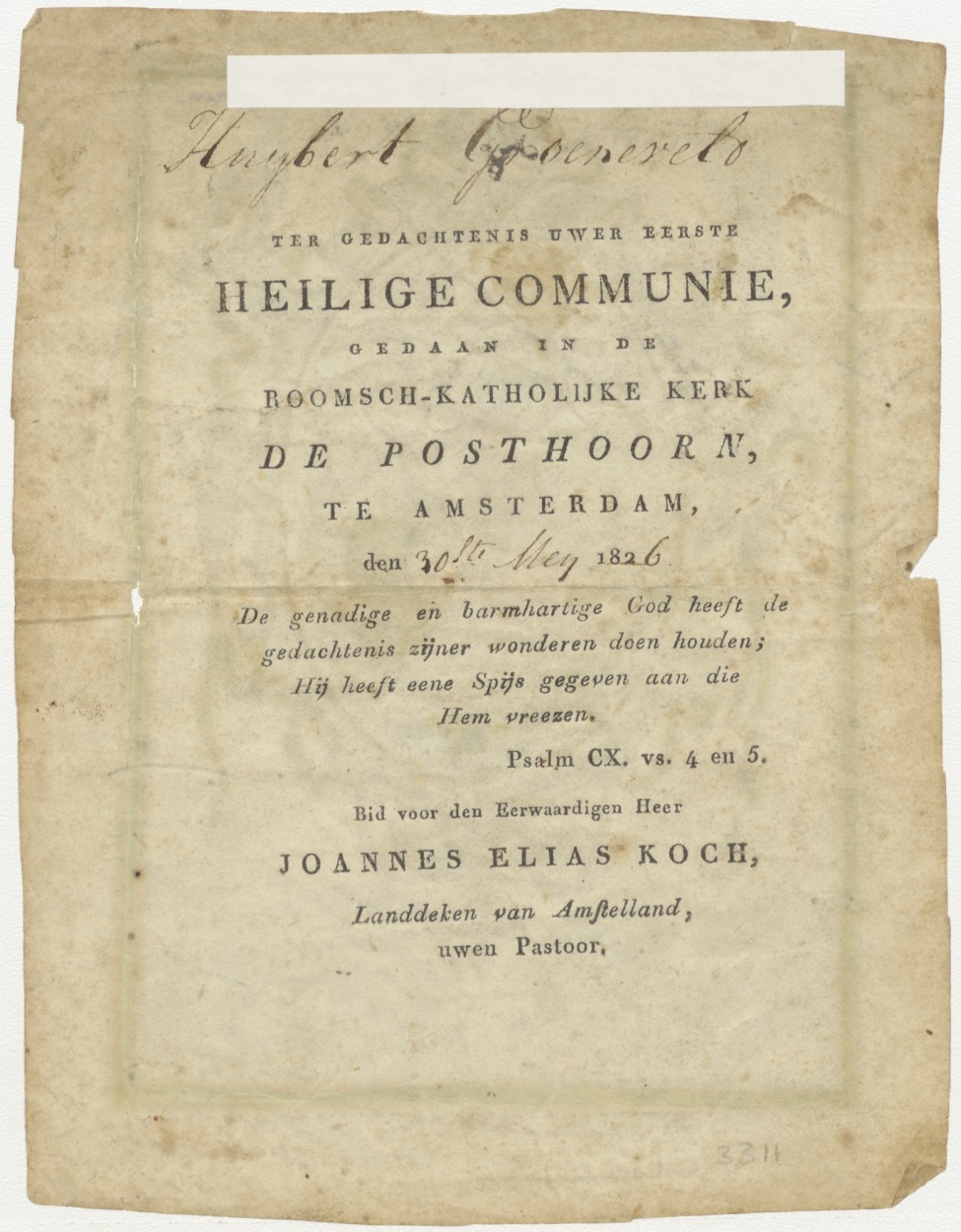 Christus geknield op kruis, ingekleurd, kz. H. Communie Groeneveld;1826;de Posthoorn;Amsterdam;door pastoor Joannes Koch;etc.;