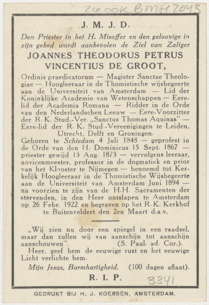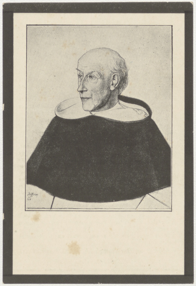 Foto van tekening van Joannes de Groot naar tekening van Toorop, kz. Religieus; bid voor ziel Joannes de Groot (+1922) dominicaan, professor Nijmegen
