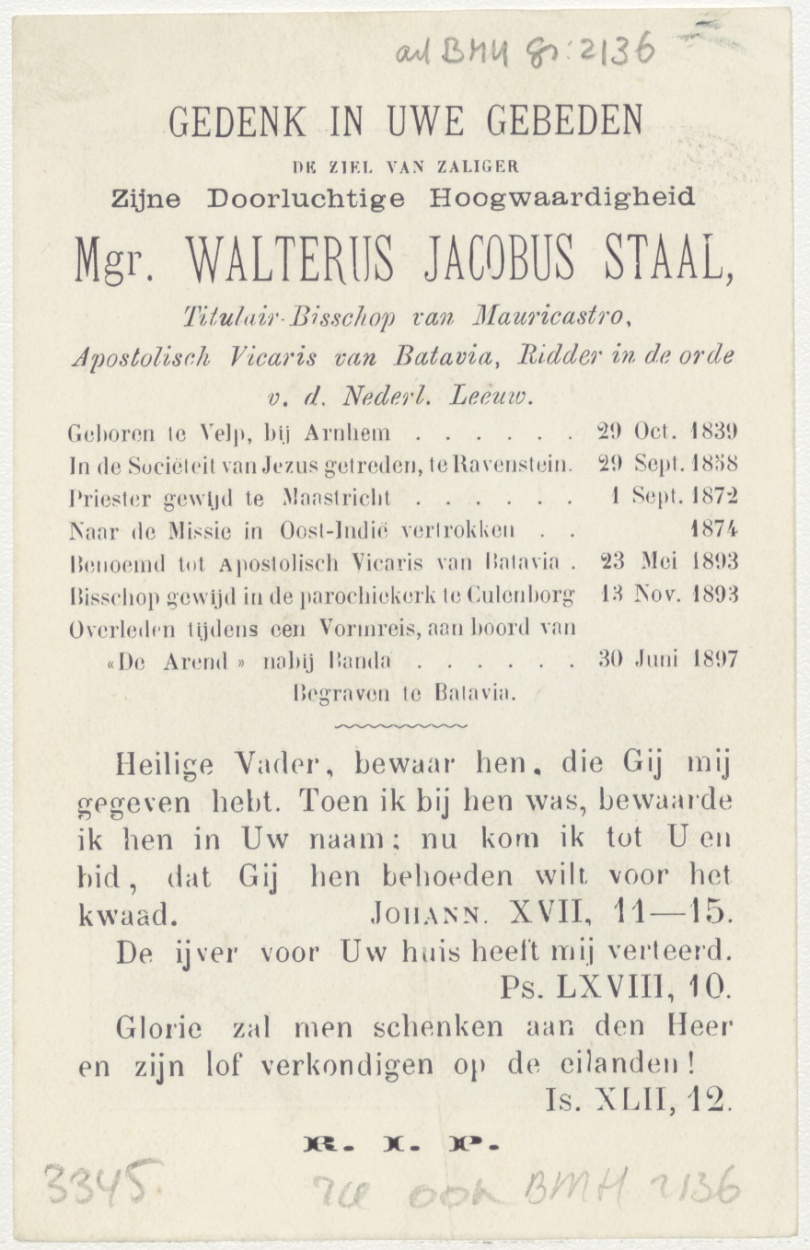 Portret van Walterus Staal (1839-1897), kz. Religieus; bid voor ziel Walterus Staal (+1897) titulair bisschop van Mauricastro