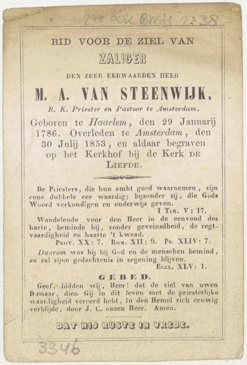 H. Antoine (Frans), kz. Religieus; bid voor ziel M.A. van Steenwijk (+1853) pastoor te Amsterdam