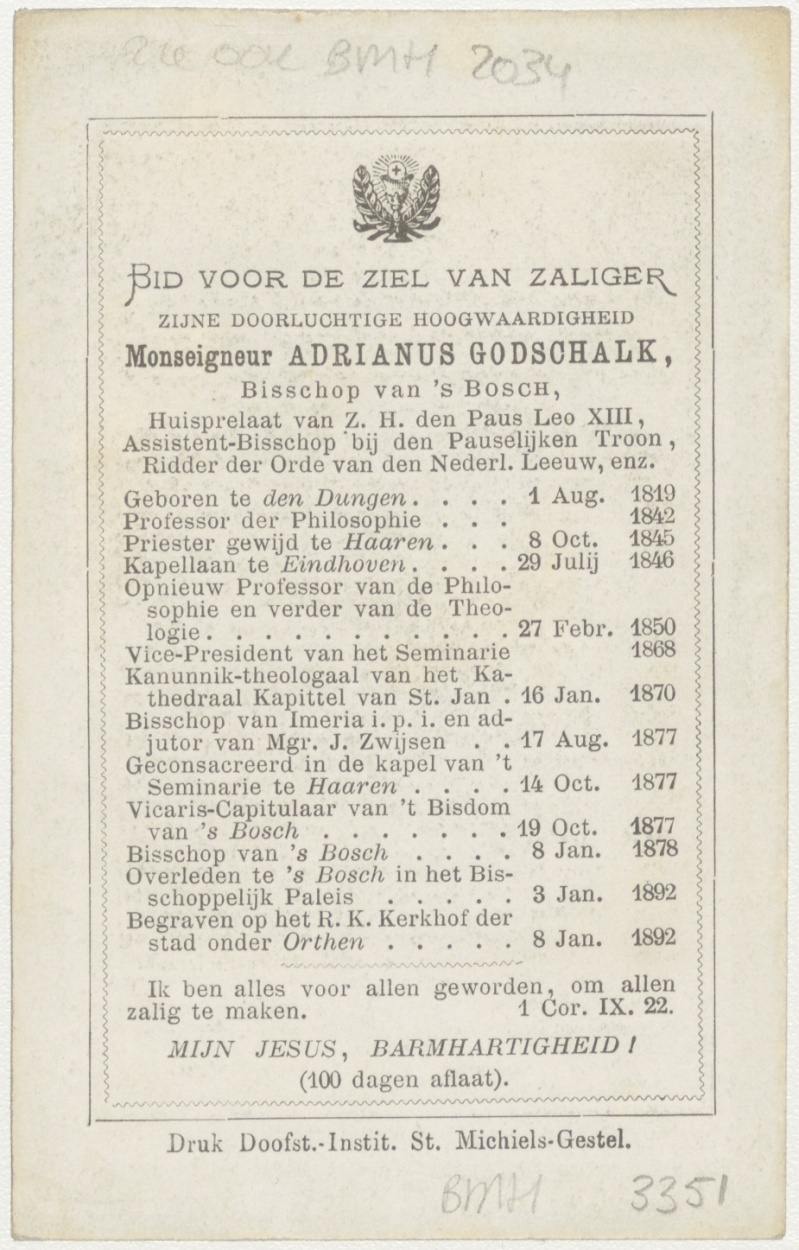 Christus met doornenkroon (Frans), kz. Religieus; bid voor ziel Adrianus Godschalk (+1892) bisschop van Den Bosch