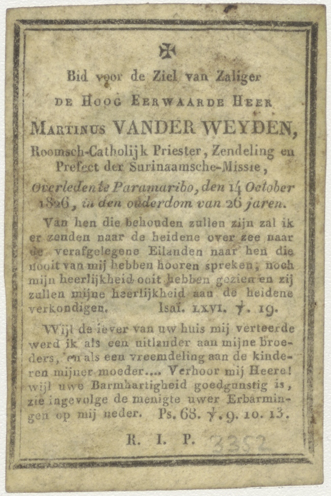 Visitatie, kz. Religieus; bid voor ziel Martinus van der Weyden (+1826) priester Surinaamse missie