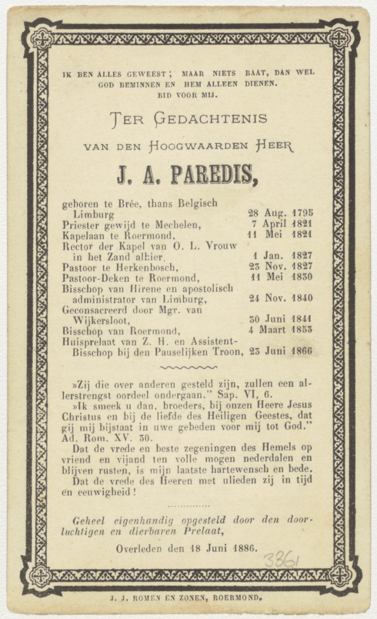 Gebed (Frans), kz. Religieus; bid voor ziel J.A. Paredis (+1886), bisschop van Roermond