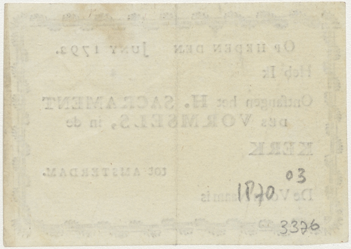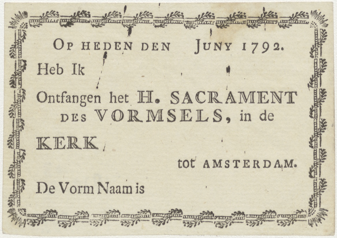Op heden den ... Juny 1792. Heb ik ... ontfangen het H. Sacrament des vormsels, in de kerk ... tot Amsterdam. De vormnaam is ...