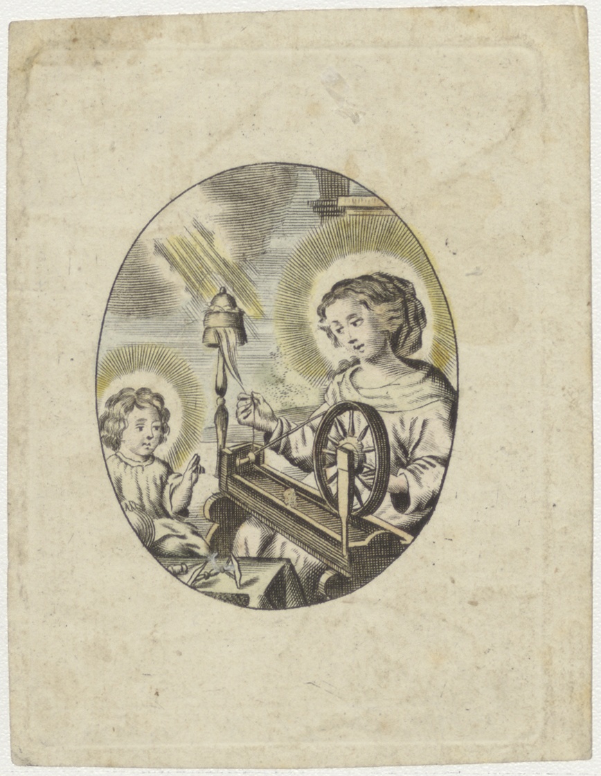 Maria aan het spinnewiel met Christuskind, ingekleurd