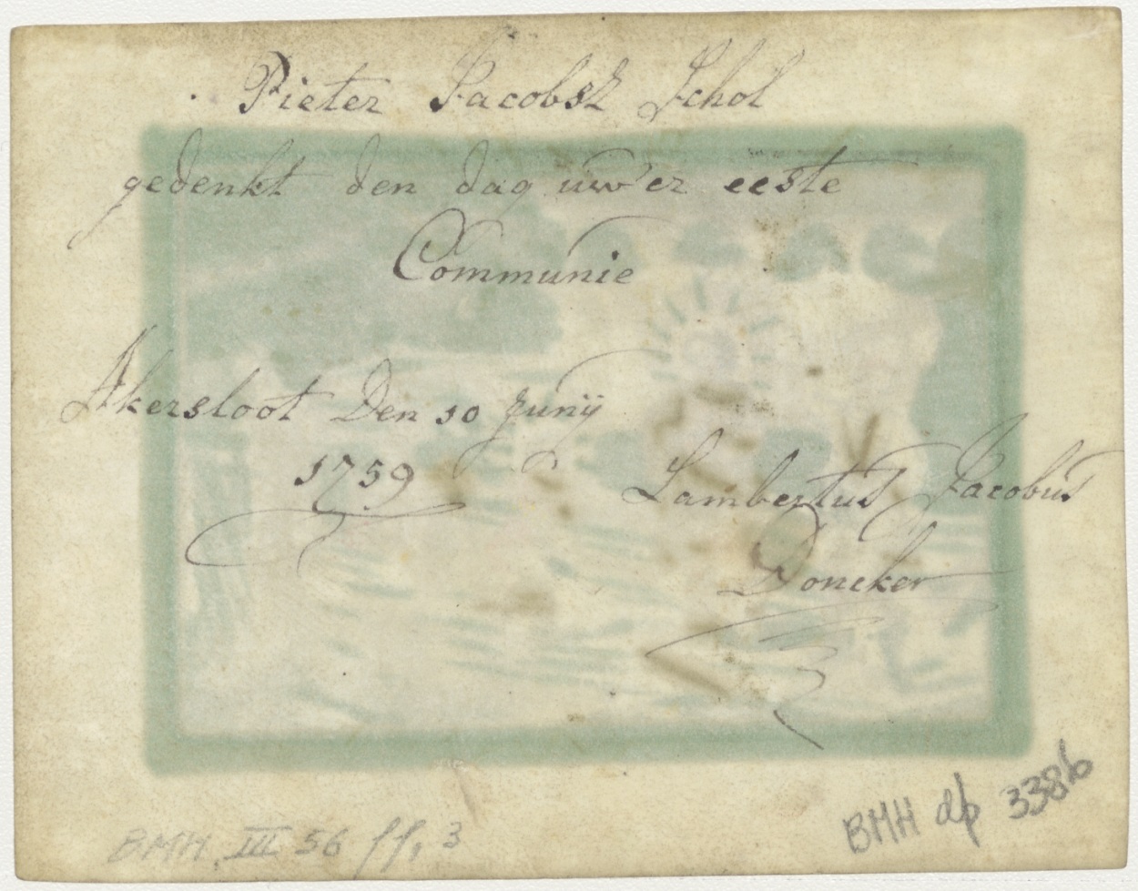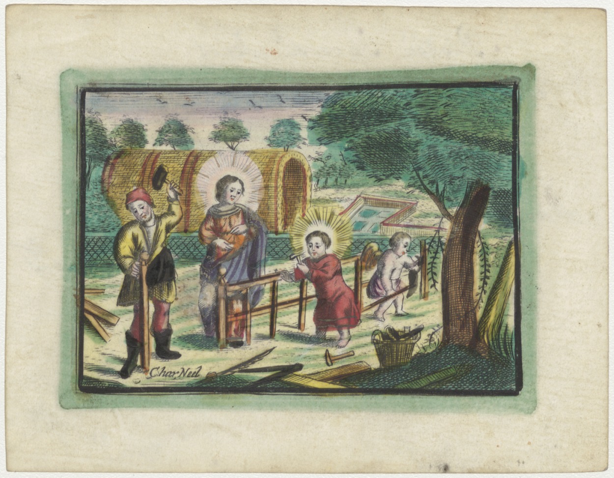 H. Familie; timmermanswerkplaats, ingekleurd, kz. H. Communie Schol;1759; Akersloot pastoor Doncker