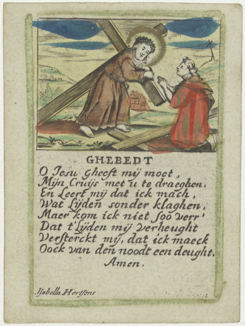 Kruisdraging van Christus, ingekleurd, met "Ghebedt O Jesu gheeft mij moet, Mijn Cruijs met u te draeghen. ..."