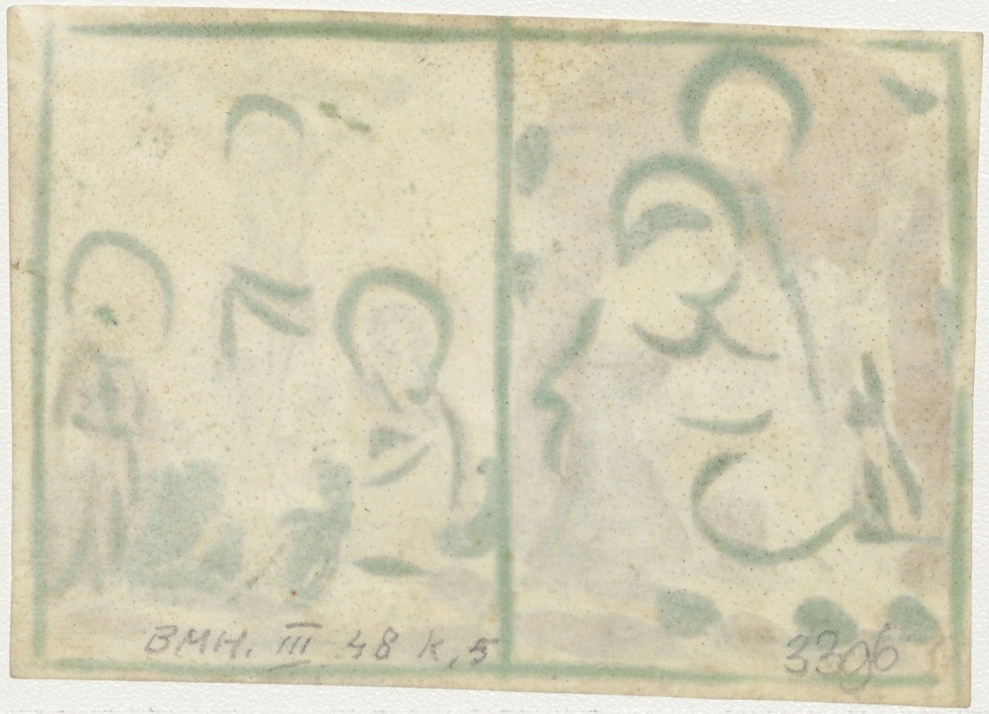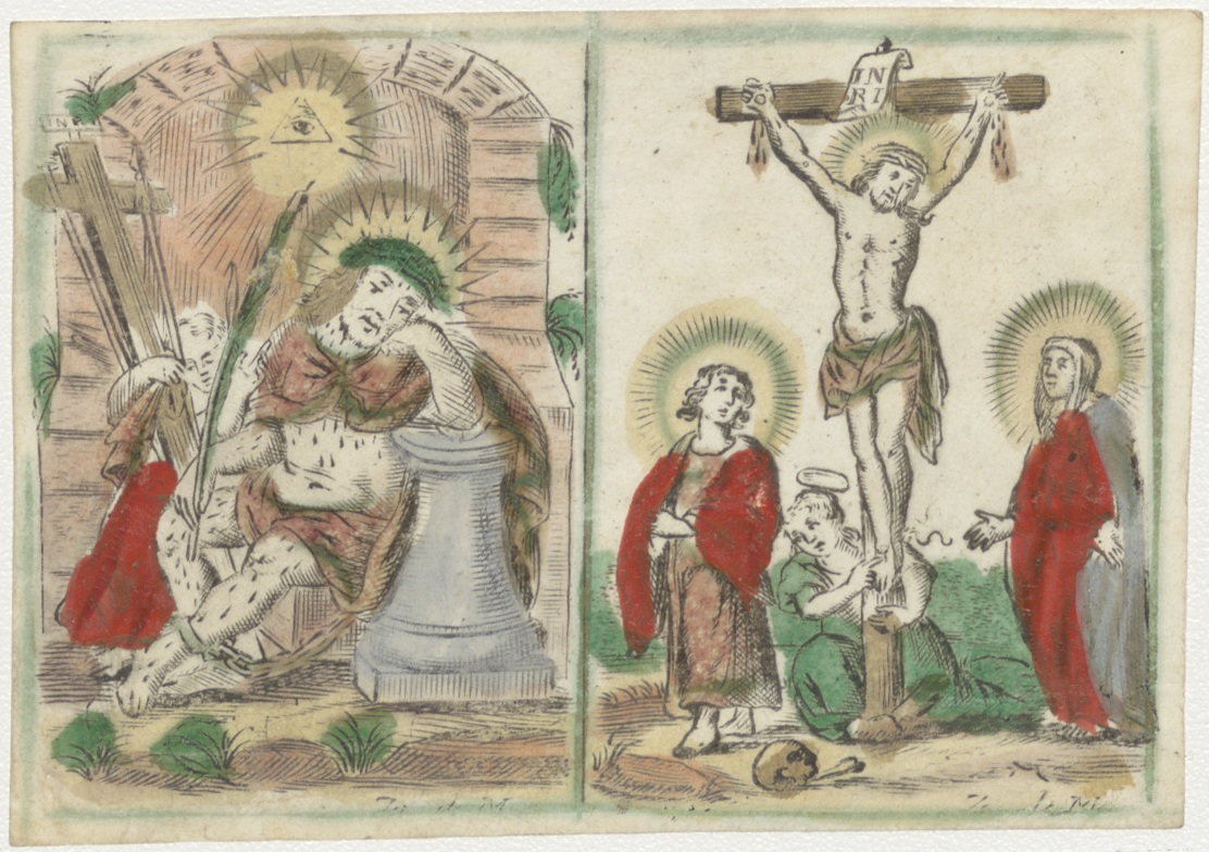 Dubbelprent: Christus als Man van Smarten, Christus aan het kruis, ingekleurd