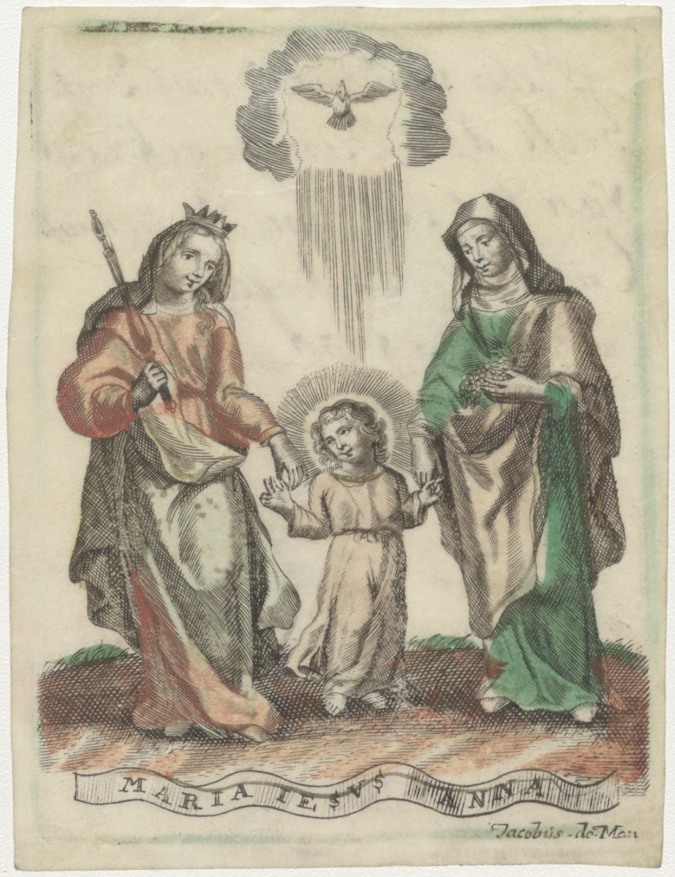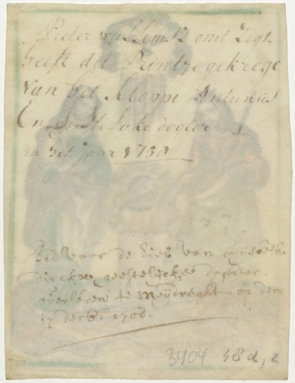 Anna te drieën, ingekleurd, kz. religieus; dubbelgebruik; bid voor ziel Lijsbeth Dirckx (+1708), Mijdrecht, beloning aan Willemsz. van klopje Antunus (1758)