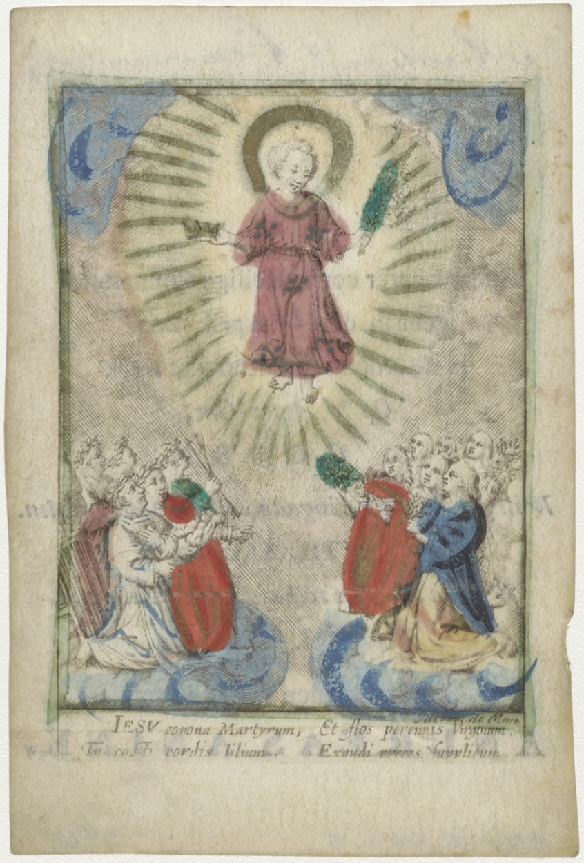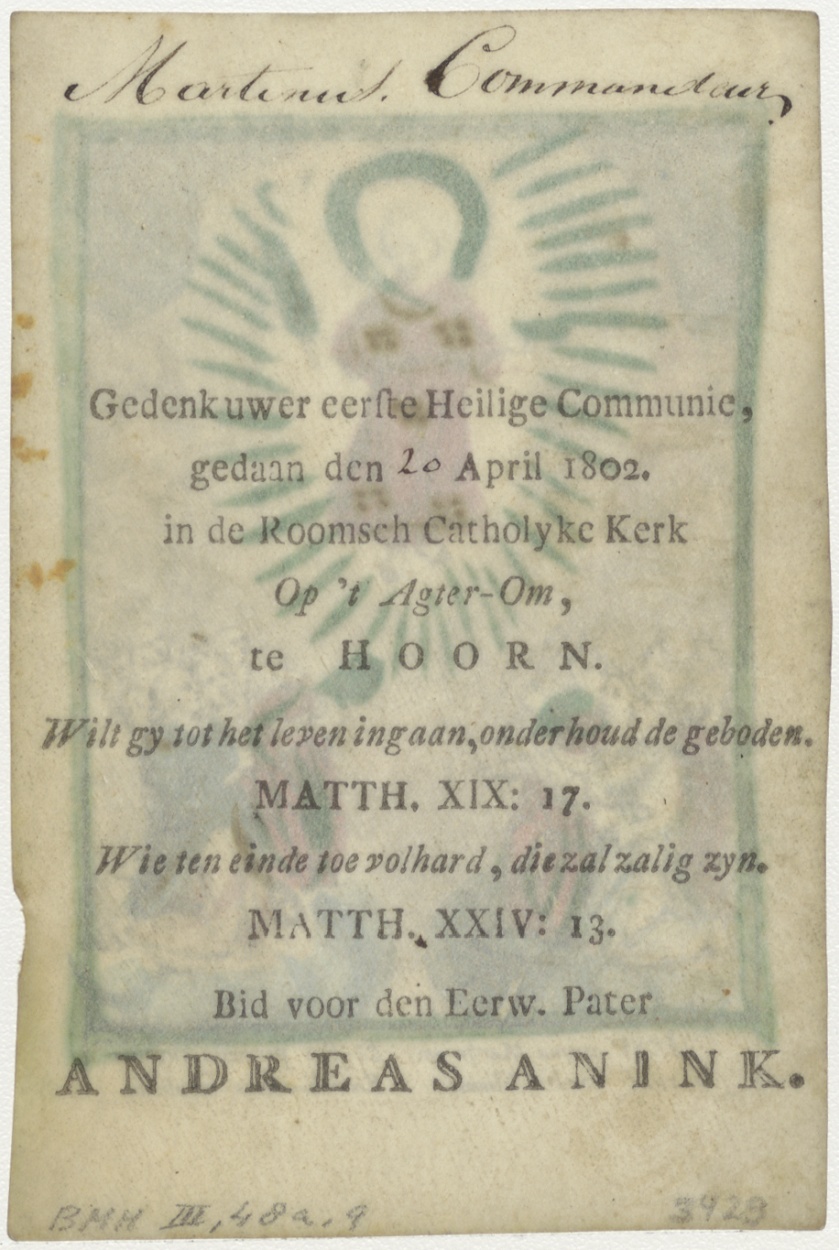 Christuskind in hemel, ingekleurd, kz. H. Communie Commandeur 1802; Op 't Agterom Hoorn pastoor Anmdreus Anink