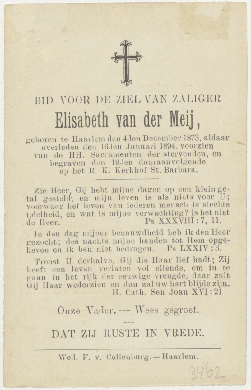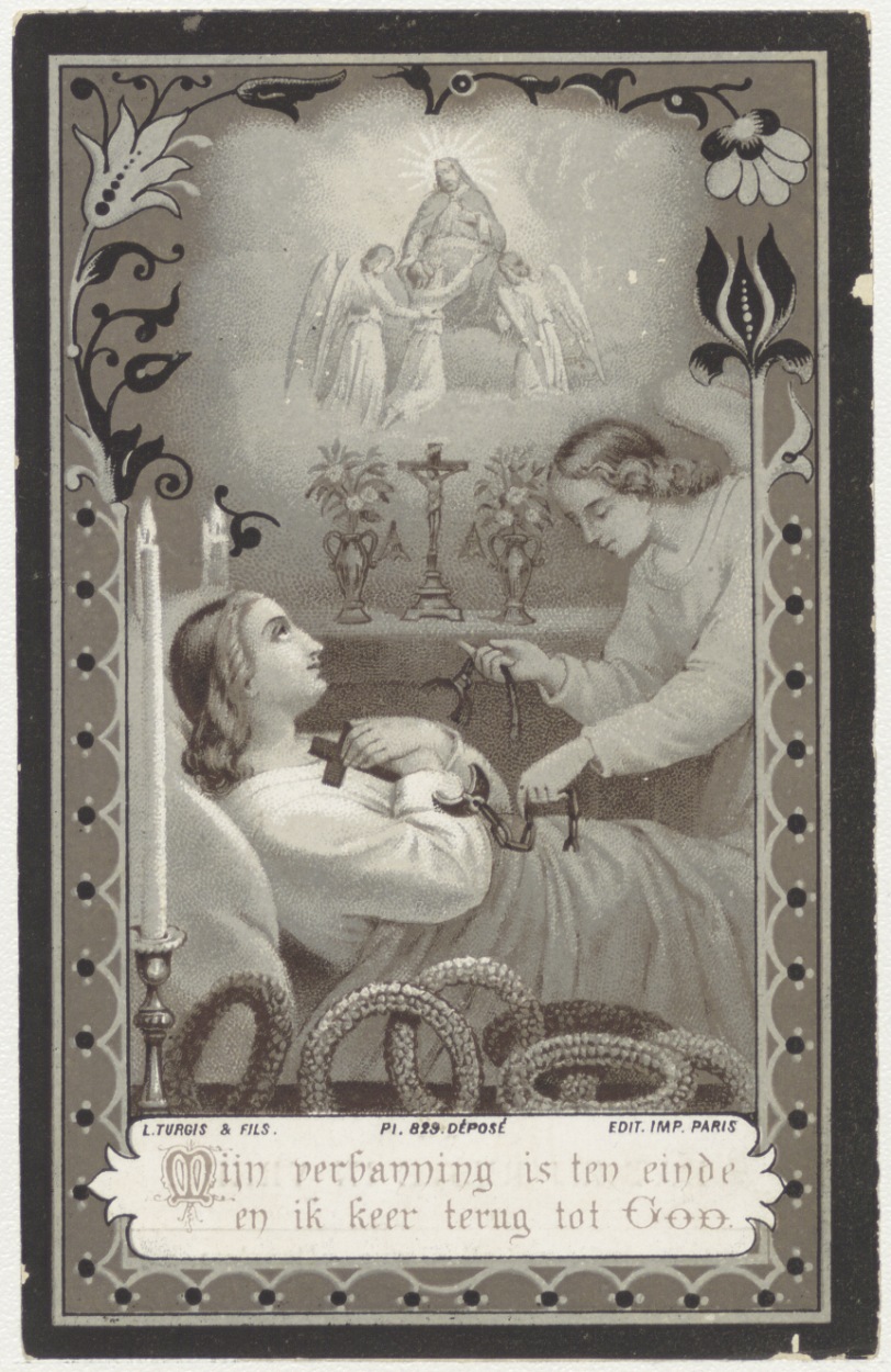 Man op sterfbed; 'mijn verbanning...', kz. bid voor ziel van der Meij (+1894) Haarlem
