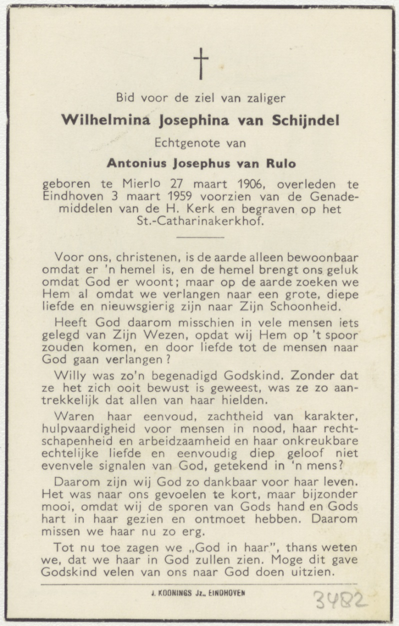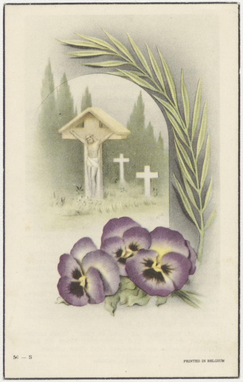 Gekruisigde Christus met viooltjes, ingekleurd, kz. bid voor ziel van Rulo-van Schijndel (+1959) Eindhoven
