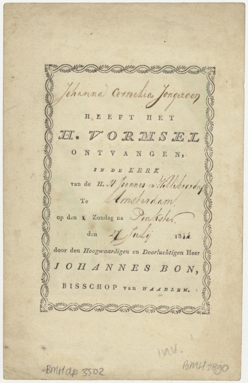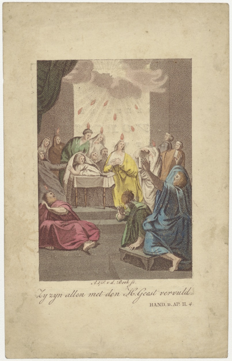 Pinksteren, nederdaling van de H. Geest, ingekleurd, kz. H. Vormsel Joanna Cornelia Jongezoon (1831) door bisschop J. Bon, Joannes en Willibrordeskerk, Amsterdam