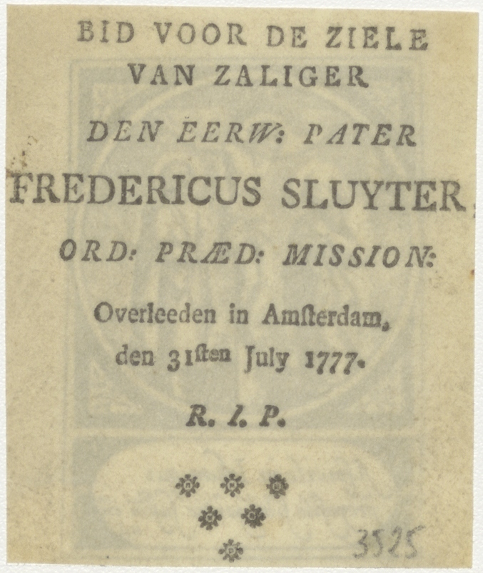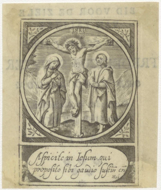 Gekruisigde Christus met Johannes en Maria, kz. Religieus; bid voor ziel Fredericus Sluyter (+1777) predikheer Amsterdam