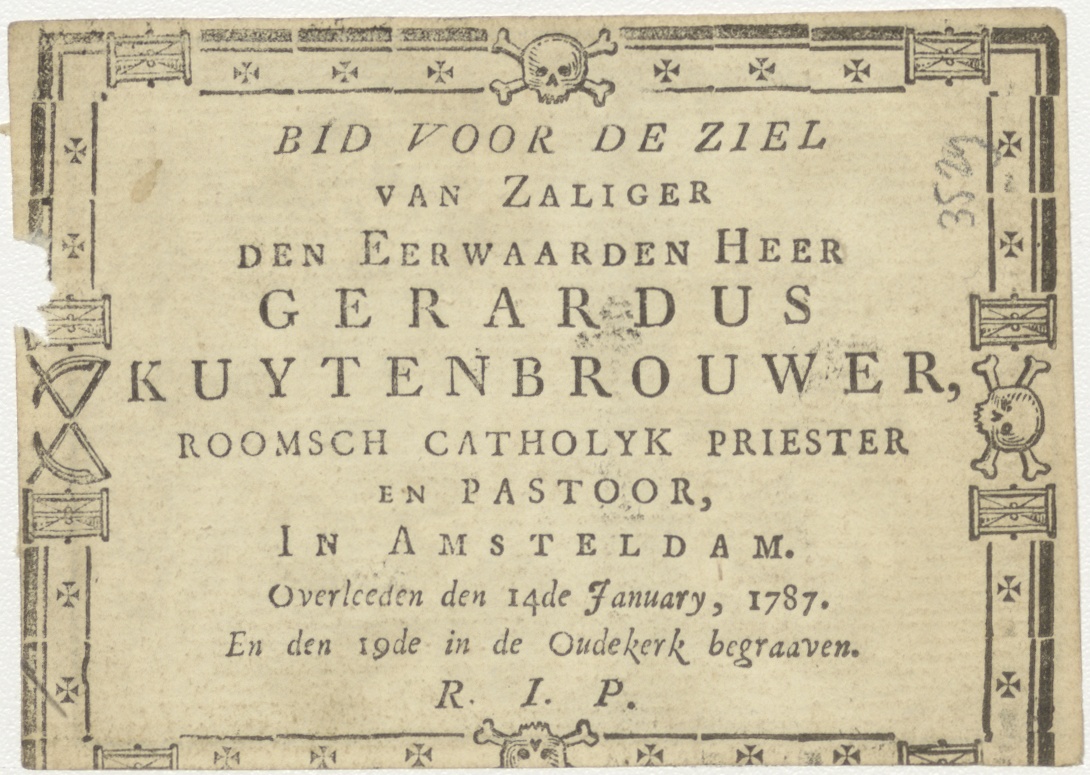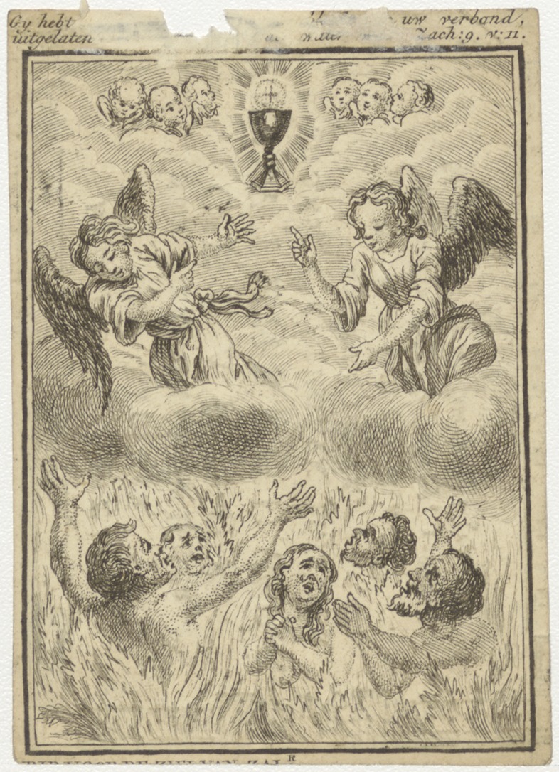 Mensen in de hel bidden tot engelen in de hemel, kz. Religieus; bid voor ziel Gerardus Kuytenbrouwer (+1787) pastoor te Amsterdam