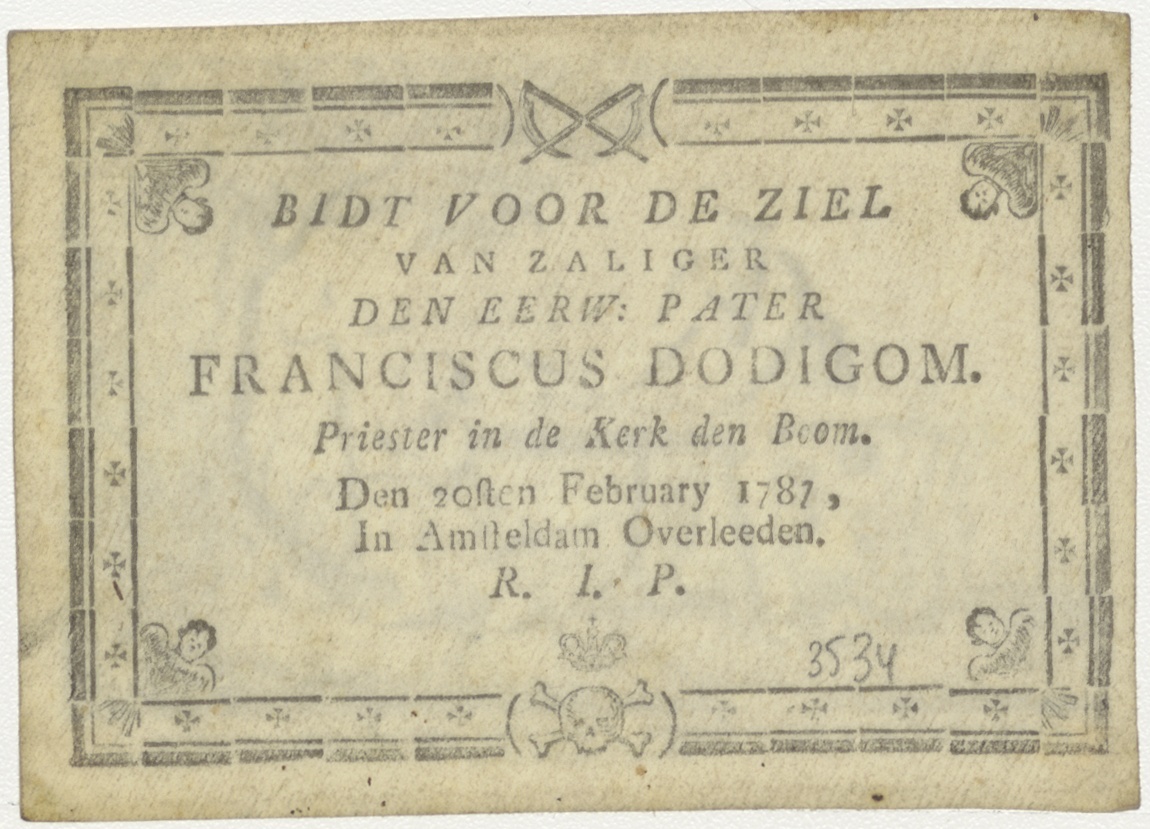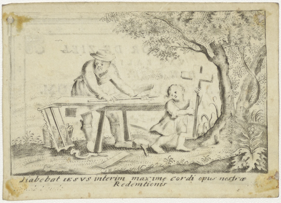 Timmermanswerkplaatsscène met Jozef en Christuskind, kz. Religieus; bid voor ziel Franciscus Dodigom (+1787) pastoor kerk den Boom Amsterdam