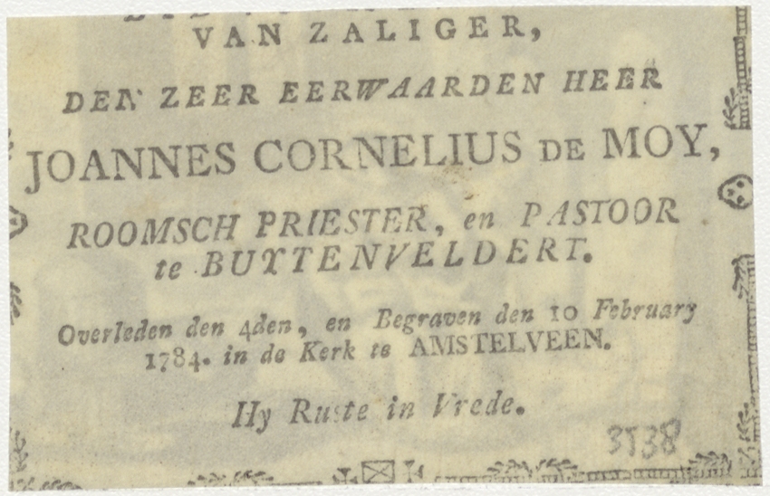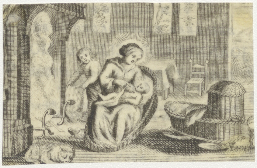Maria met Christuskind, huiselijke scène, kz. Religieus; bid voor ziel Joannes de Moy (+1784) pastoor Buitenveldert