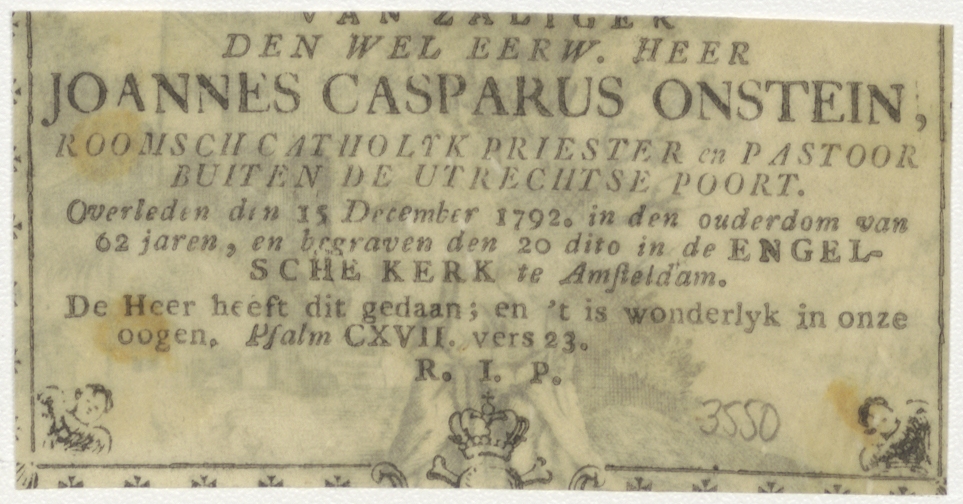 Visitatie, kz. Religieus; bid voor ziel Joannes Onstein (+1792) pastoor buiten de Utrechtsepoort