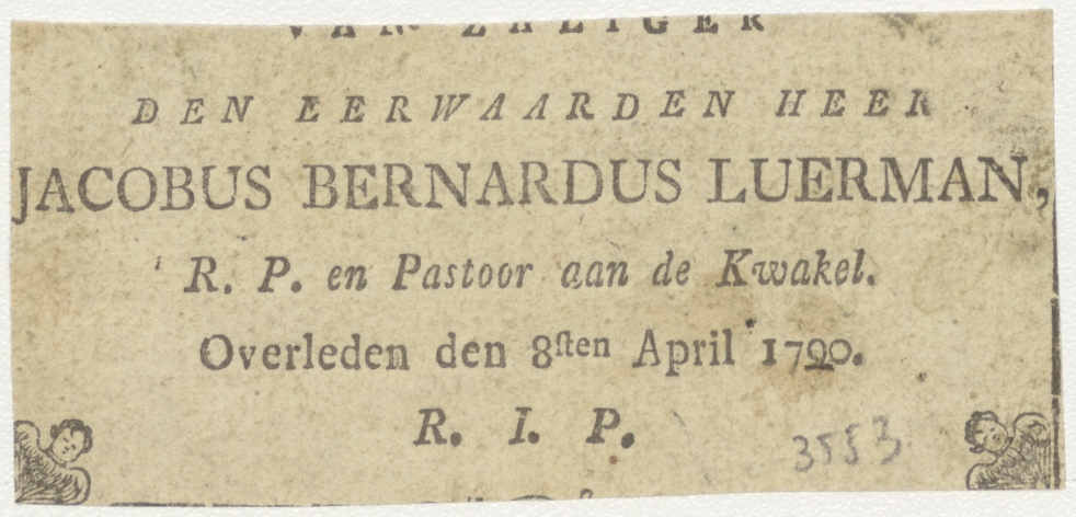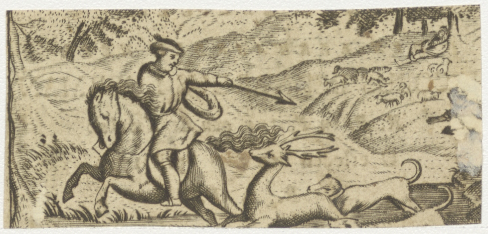 Jachtscène, kz. Religieus; bid voor ziel Jocobus Luerman (+1790) pastoor aan de Kwakes