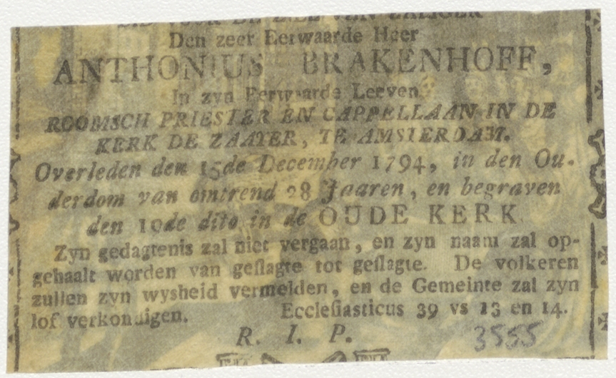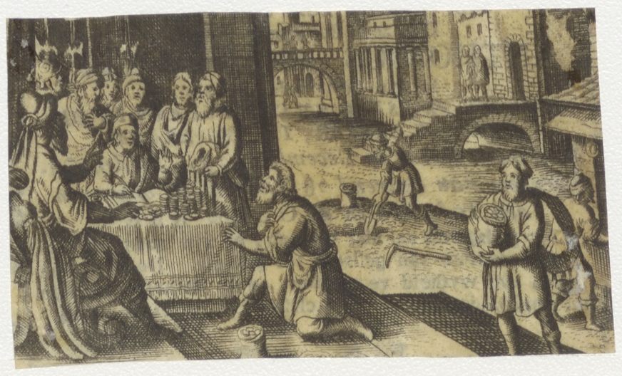 Rijke geldwisselaar met bedelende arme man, kz. Religieus; bid voor ziel Anthonius Brakenhoff (+1794), Amsterdam, pastoor De Zaaijer te Amsterdam