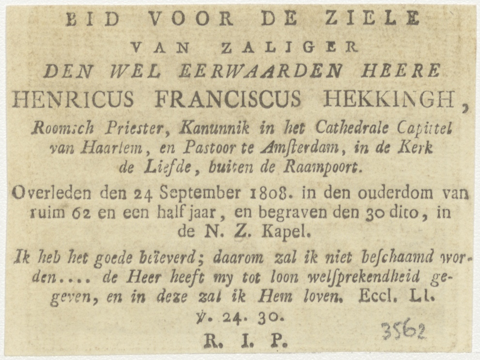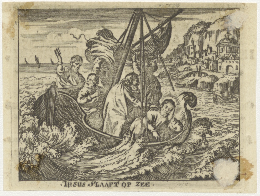 Christus slaapt op het meer van Galilea, kz. Religieus; bid voor ziel Henricus Hekkingh (+1808) kanunnik kapittel Haarlem