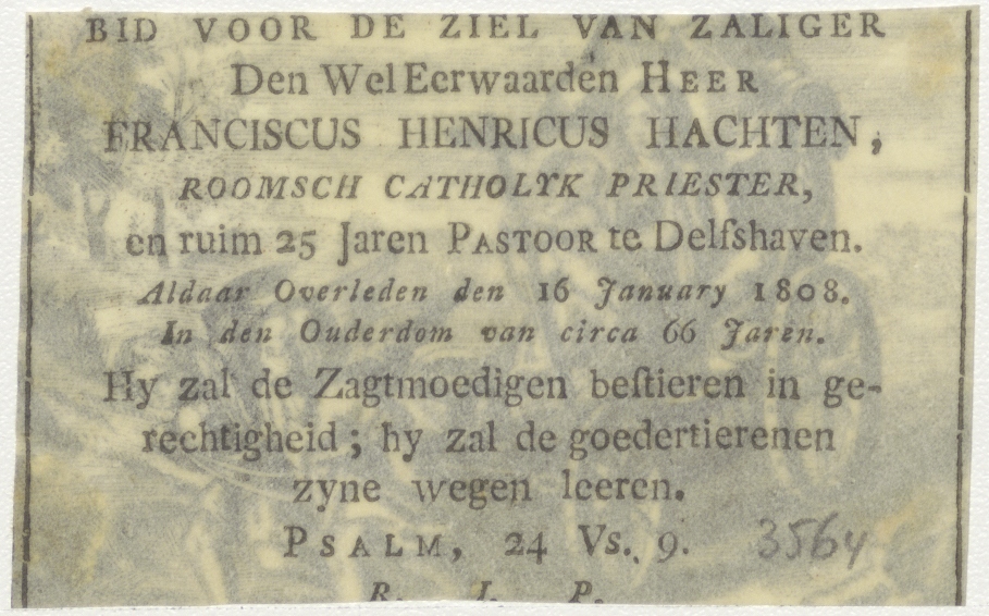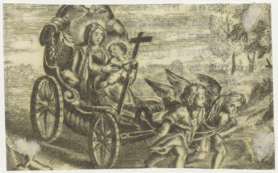 Maria met Christuskind op triomfwagen, kz. Religieus; bid voor ziel Franciscus Hachten (+1808) pastoor Delfshaven