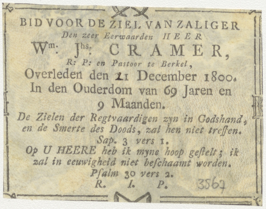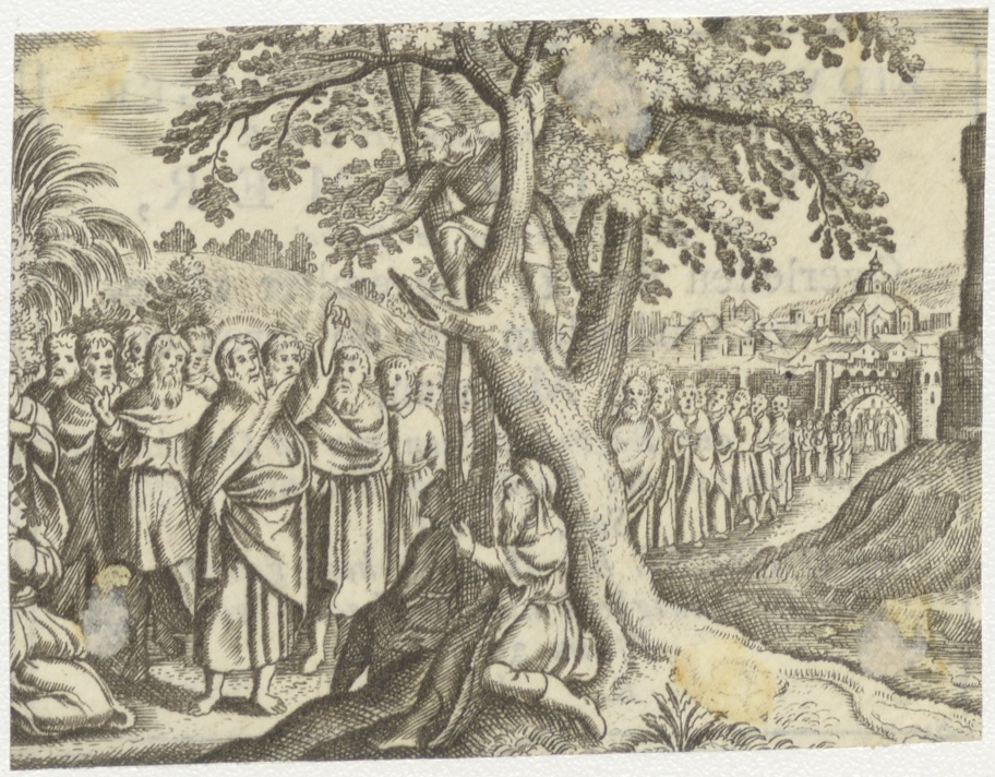 Christus wijst naar Zacheus in de boom, kz. Religieus; bid voor ziel W.J. Cramer (+1800) pastoor te Berkel