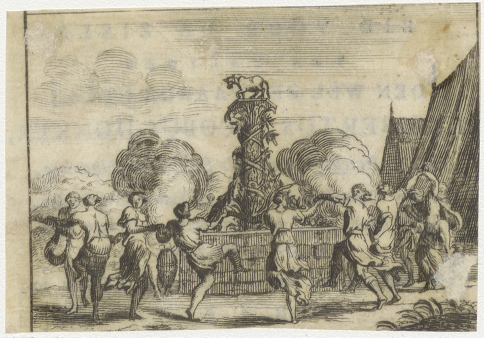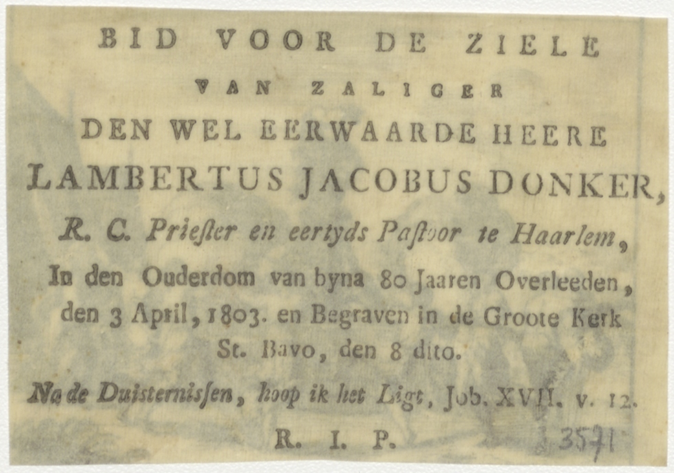 Dans rond het gouden kalf, kz. Religieus; bid voor ziel Lambertus Donker (+1803) pastoor te Haarlem