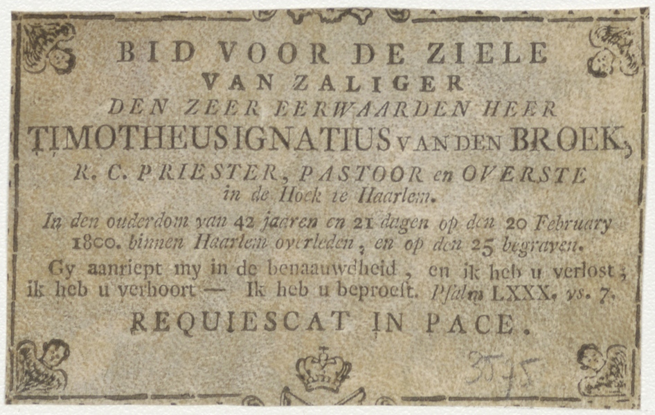 Landschap, kz. Religieus; bid voor ziel Timotheus van den Broek (+1800) pastoor in de Hoek Haarlem