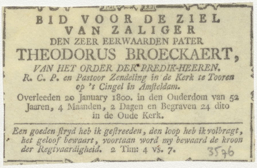 H. Vrouw, kz. Religieus; bid voor ziel Theodorus Broeckaert (+1800) pastoor kerk te Tooren Singel Amsterdam