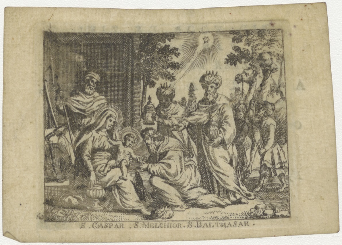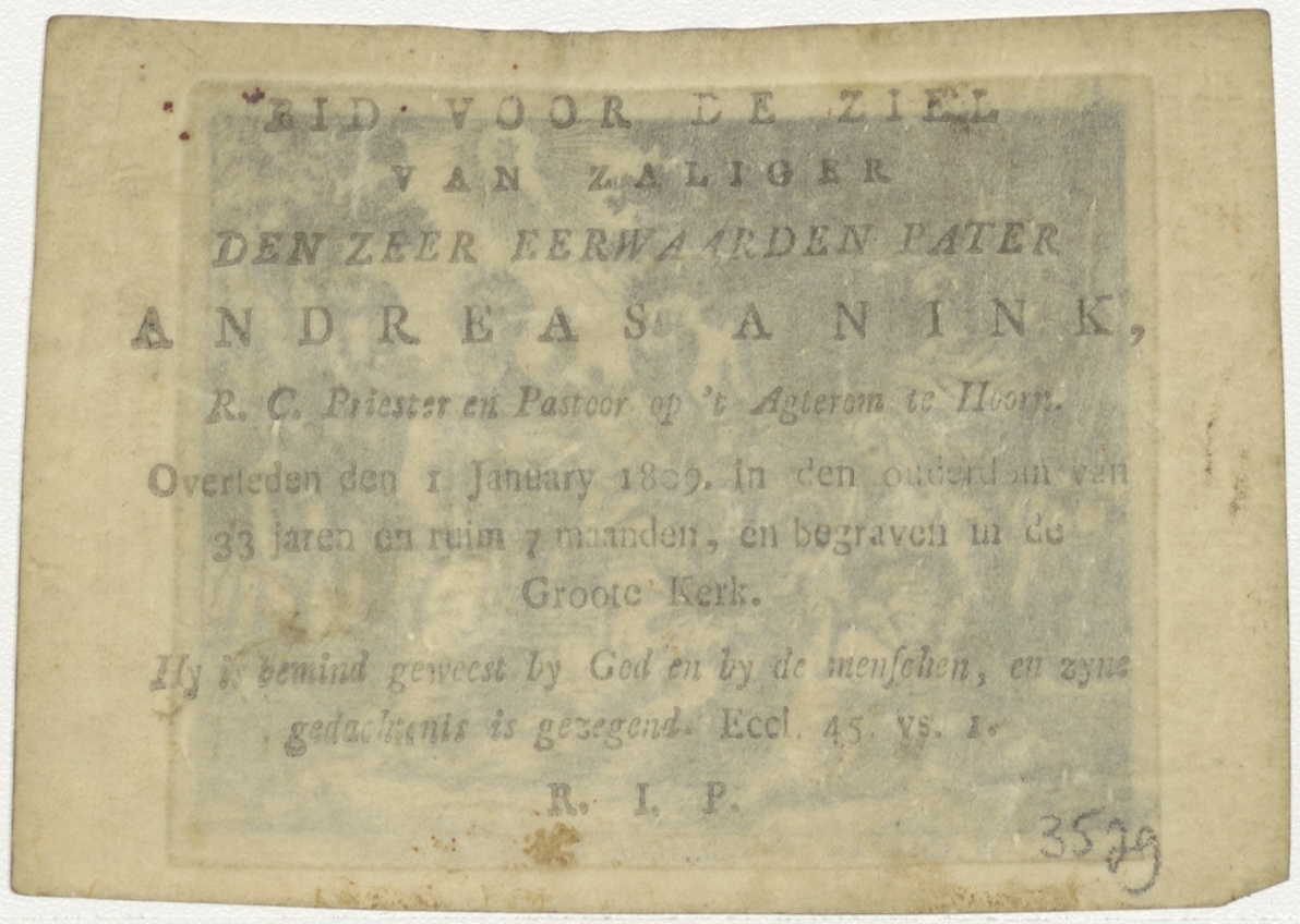 Aanbidding der koningen, kz. Religieus; bid voor ziel Anareas Anink (+1809) pastoor op 't Agter om te Hoorn