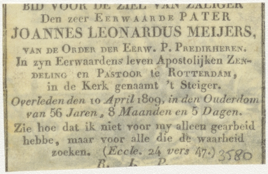 H. Johannes de Evangelist, kz. Religieus; bid voor ziel Joannes Meyers (+1809) predikheer, pastoor 't Steyger Rotterdam