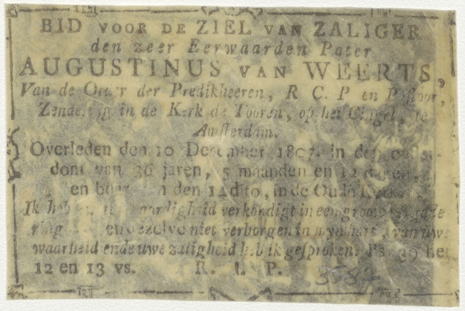 Christus als duiveluitdrijver, kz. Religieus; bid voor ziel Augustinus Weerts (+1807) predikheer, pastoor De Tooren op de singel Amsterdam