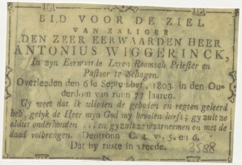 Doop van de kamerling, kz. Religieus; bid voor ziel Anthonius Wagerinck (+1803) pastoor te Schagen