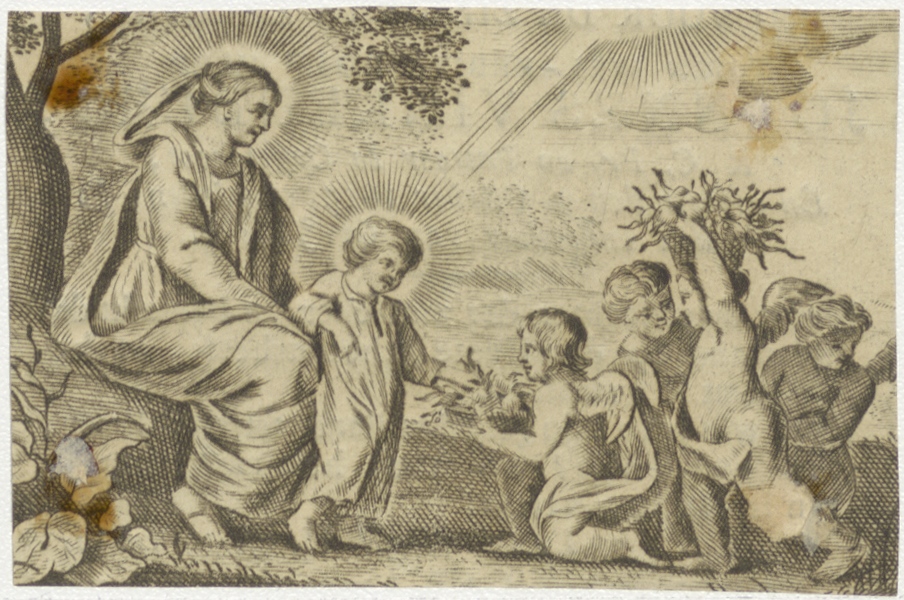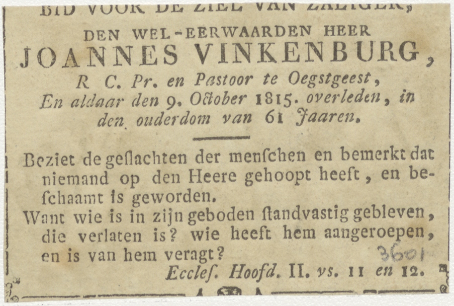 Maria met Christuskind en engelen, kz. Religieus; bid voor ziel Joannes Vinkenburg (+1815) pastoor te Oegstgeest